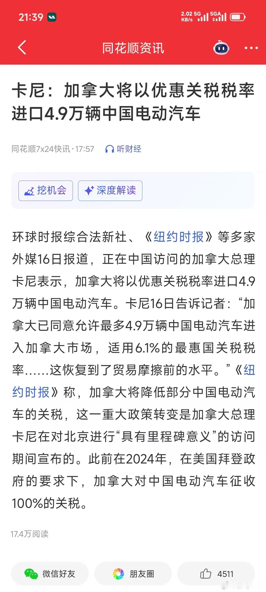 加拿大以优惠关税进口 4.9 万台中国电动车,估计不少美国人要跑去加拿大提车了,不知道这次谈的是哪些品牌,不多,但是一个好的开始👍