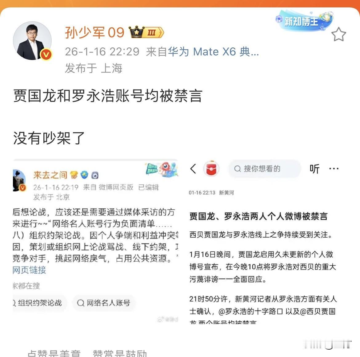 孙少军:罗永浩和贾国龙的微博被禁言了,微博CEO回应。 就在刚才,孙少军引用了新黄河发出来的消息,他们两个人的个人社交微博账号,都被禁言了。 但是贾国龙在今天晚上9:30多的时候,通过西贝的官方社交账号,进行了所谓的全面回应,他这个回应还是比较长的,涉及到的内容是关于公司和家人的。 微博CEO,来去之间对这个事情进行了解释,意思就是,他们这种网络上的大V,有什么事情需要解决,还是要通过正规的媒体采访的方式来表达,而不是通过网络的方式。 又有博主有罗永浩的个人微信,他发了一个简单的朋友圈,但是这个博主并没有透露具体的内容,但是从他的表述能够看到,这个事情应该就这样算了。