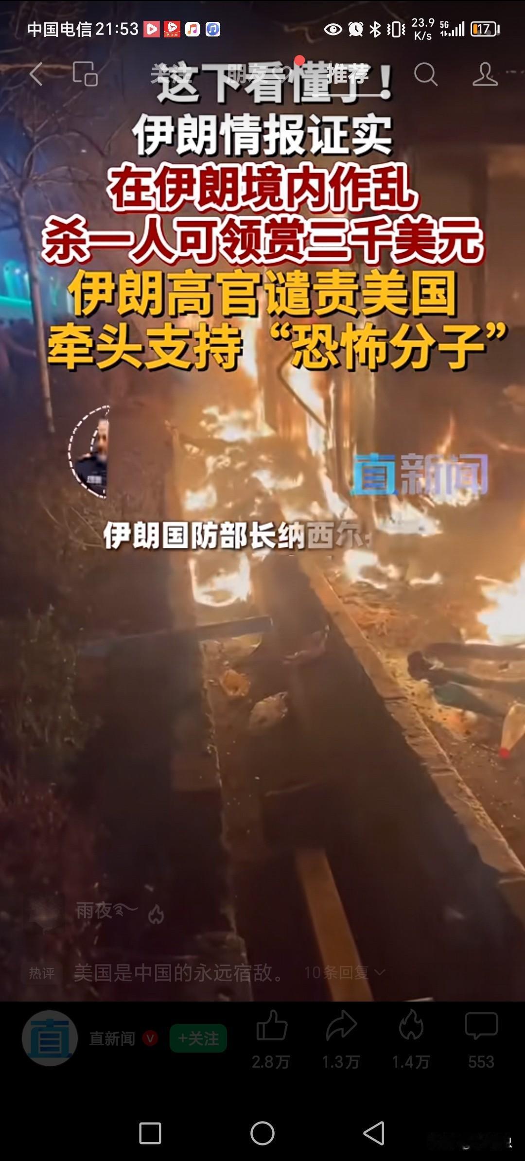 伊朗全国上下一心抗敌,但美国牵头,支持伊朗内部恐怖分子,制造混乱。 烧一部车1300美元,每杀一个人3300美元。 这起用钱收买人心,的做法。 被伊朗内部精准情报掌握。 伊朗目前,内外都不稳。 美国打击伊朗,从试探,到现在明目张胆。 不知道伊朗到底有没有核牌可打。