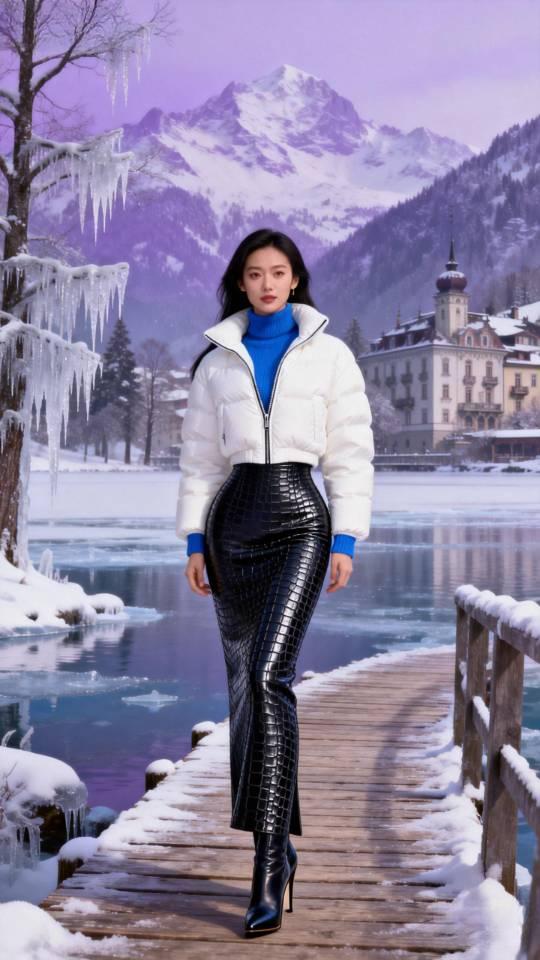 衣服冬日穿搭:白羽绒服+黑皮半身长裙。衣服穿搭 美女壁纸