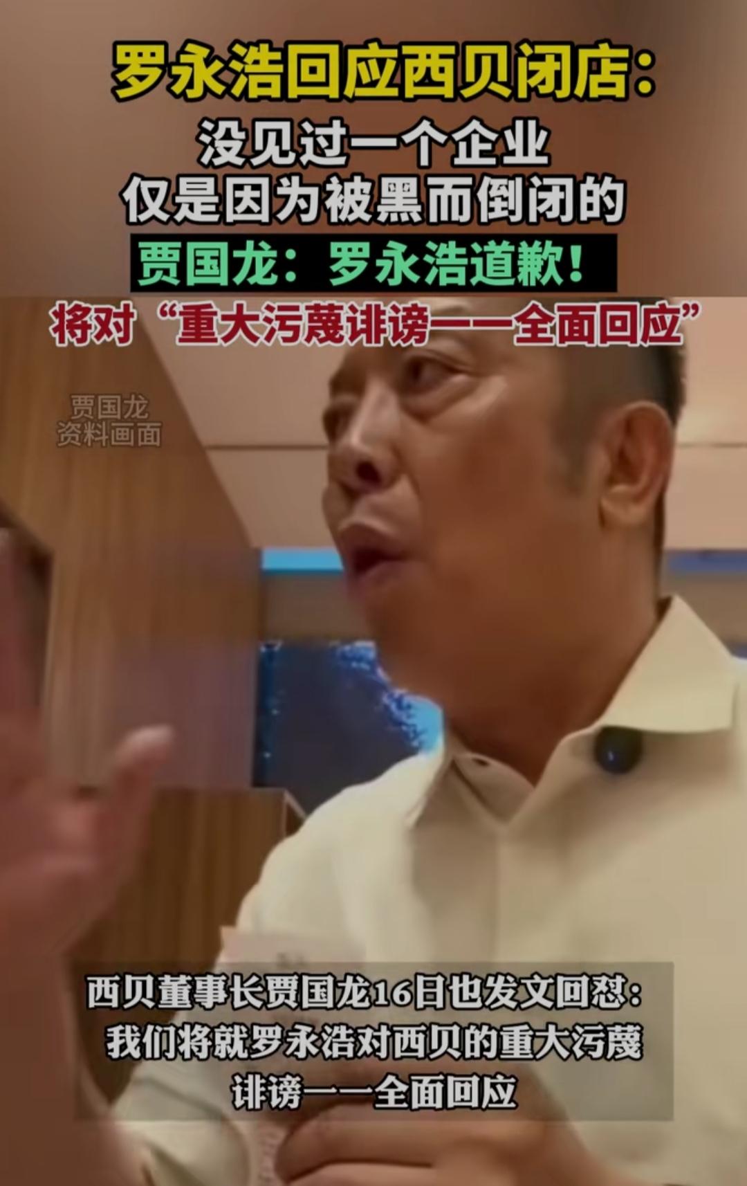 罗永浩硬刚西贝!闭店风波掀骂战,餐饮圈这瓜来得猝不及防!罗永浩突然点评西贝闭店,直言“没见过哪个企业光靠被黑就倒闭的”,话里话外暗指闭店另有隐情,这波发言直接把西贝创始人贾国龙惹毛了。 贾国龙当场硬刚回怼,不仅要求罗永浩赶紧道歉,还放狠话要对所谓的“重大污蔑诽谤”逐一全面回应,这火药味隔着屏幕都能闻到!本来西贝闭店就引发不少讨论,有人感慨餐饮行业内卷难存活,有人好奇是不是经营出了问题。 罗永浩自己也是创业过来人,按理说该懂创业的难和委屈,可这次偏偏下场锐评,属实让人意外。一边是敢说敢言的“耿直创业者”,一边是护企心切的餐饮大佬,这场互怼到底谁对谁错?背后是不是还有没说透的隐情?你站哪边?