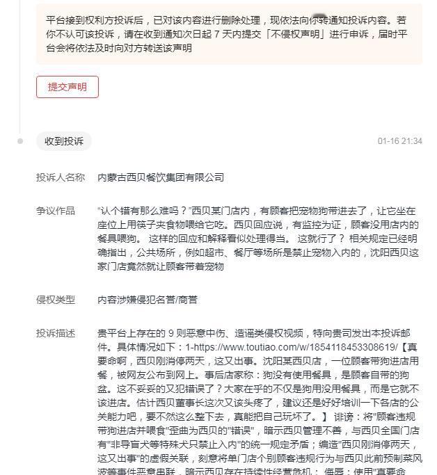 我摊上事儿了!就在一小时前,我被西贝投诉了,说我关于沈阳某家西贝门店宠物狗在店内进食的一篇微头条捏造事实,被删了。 西贝还挺较真的,那么认真阅读了我的微头条,在字里行间找出不妥的地方,还特意为此向平台投诉,把我的那篇微头条删了。 好吧,我也道歉,不该说顾客用筷子夹着食物喂狗,因为顾客给狗单独带了餐具的。 另外,我说让狗坐在座位上,不知道是否也不符合事实了。 我重新再描述一下,有顾客带宠物狗进了西贝在沈阳的某家门店,自带狗进食用的餐具,这边是其他顾客在吃饭,另一边是狗在吃食。 这样说,西贝没意见吧? 但我还是想问,允许顾客带狗进餐厅并且在店内喂狗,和别的顾客一起在吃东西,这样做是否得当? 事后,西贝采取相应的措施,并且表示以后不让顾客带狗进店了。 我应该表扬一下西贝是吧? 事实上,很多餐厅就不会让这样的事发生,所以我就不表扬西贝了。 我就是一个没多少流量没多少粉的普通条友,没想到写了一篇小作文还被西贝这么重视。 我建议,有这时间和精力用在改进菜品和服务上,收获会更多。