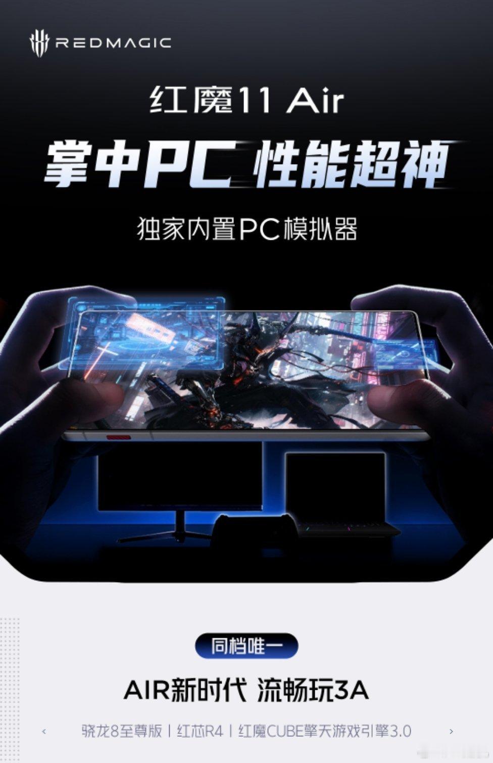 红魔 11 Air 手机将于 1 月 20 日 15:00 发布,官方今日宣布新机搭载骁龙 8 至尊版处理器、自研电竞芯片红芯 R4,匹配 LPDDR5X ULTRA 及 UFS4.1。红魔 11 Air 手机独家内置 PC 模拟器,号称“无体验门槛、无复杂操作、多平台兼容、支持离线畅玩”。