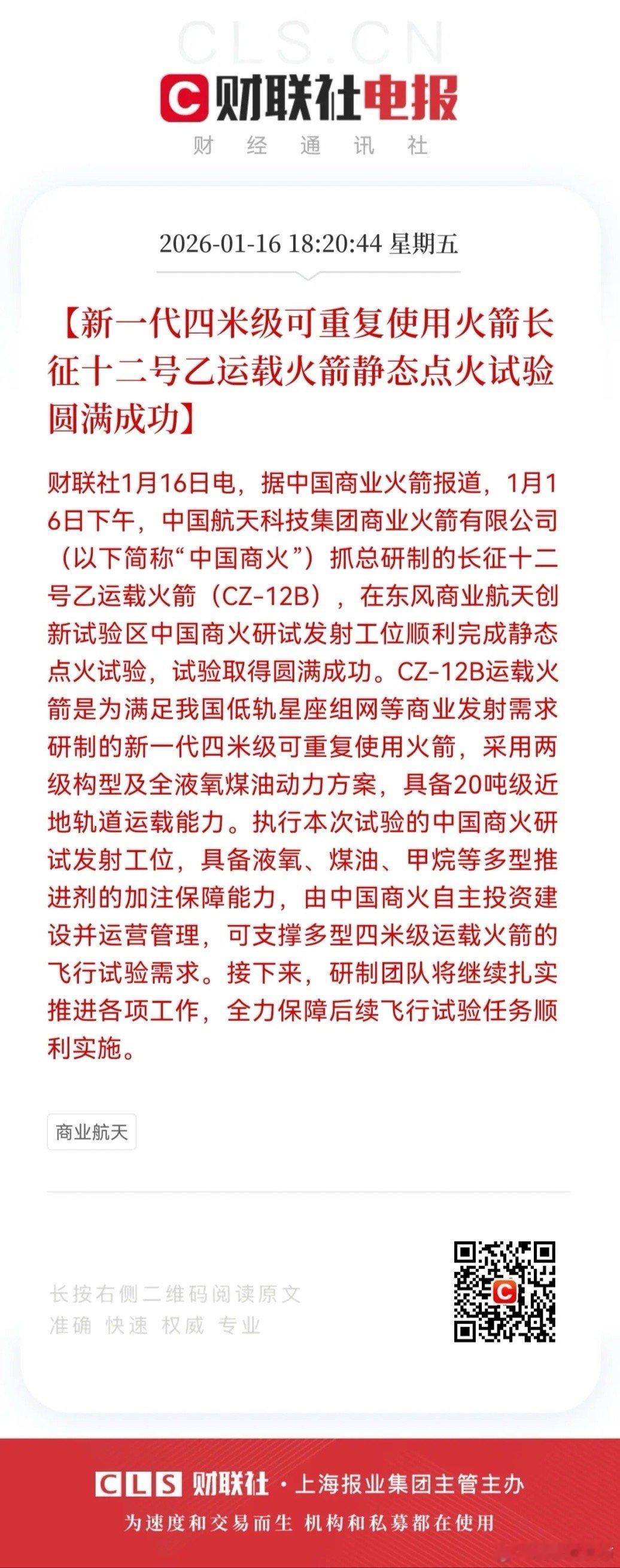 利好!大利好来了!可回收火箭点火成功,预计下星期商业航天又要起飞了。。。。。资本市场炸场级利好突袭!就在今天下午,中国商火研制的新一代四米级可重复使用长征十二号乙运载火箭,静态点火试验圆满收官,尾焰直接照亮A股投资版图!作为商业航天降本增效的核心密码,可回收技术的持续落地,正让行业从概念炒作迈入业绩兑现的黄金窗口期 。回顾上月,长征十二号成功发射后板块应声大涨,而此次静态点火验证了技术路线的成熟度,更给市场注入强心针:2026年商业航天“政策+技术+资本”三重共振已现,火箭密集首飞、星座组网提速、头部企业IPO等催化事件将密集落地。资金早已提前布局!开年以来商业航天板块融资净买入超250亿元,机构与游资抢筹核心供应链标的。随着可回收技术打破发射成本瓶颈,火箭制造、卫星组网、地面终端三大主线将持续受益,下周一板块有望复刻此前强势表现,成为新质生产力赛道的领涨先锋。持有相关标的的股民偷着乐吧!这波技术催化叠加跨年行情余温,商业航天或开启新一轮主升浪,把握产业链核心标的,见证中国航天商业化的资本盛宴。