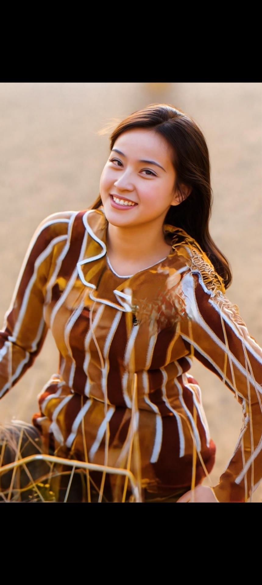 秋日暖阳下的微笑,棕白相间的条纹裙,自然又时尚。