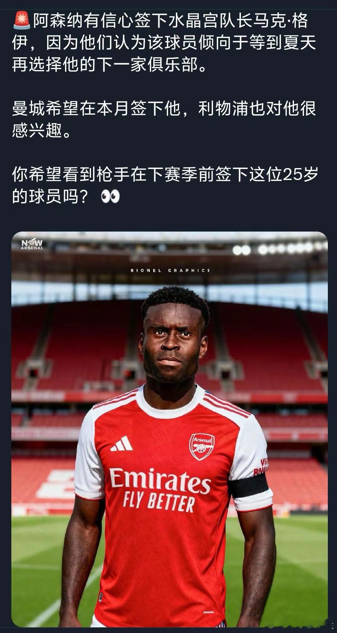 阿森纳签格伊划不划算?这是英格兰国脚,水晶宫队长,来阿森纳至少也是主力。目前曼城想买,利物浦想等到夏天,那时一堆豪门想免签。阿森纳的优势,球队稳定,1-2年内能争冠,格伊很想拿大的冠军!足球阿森纳