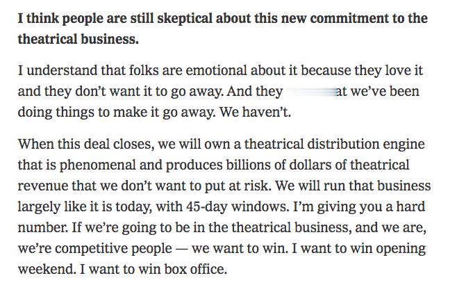 TNABO 在NYT最新发布的专访中,Netflix首席执行官泰德·萨兰多斯正面回应近期关于窗口期的热议,尤其是该公司长期推动17天窗口期和为流媒新片举行象征性放映的做法所引发的担忧,明确表示一旦完成对华纳资产的收购,原有院线电影业务基本维持不变,包括45天窗口期不会压缩:“当这笔交易完成后,我们将会拥有一套极为强大的院线发行引擎,每年能创造数十亿美元的院线票房收入,而这是我们绝对不会想冒险去破坏的东西。我们基本上会按现在的方式来运营这项业务,保持45天的窗口期。我给了你一个明确的数字。如果我们要进入院线业务——而我们确实要涉足——我们会做好胜的人,我们想要赢。我想赢得好的开画成绩,我想赢得好票房。”