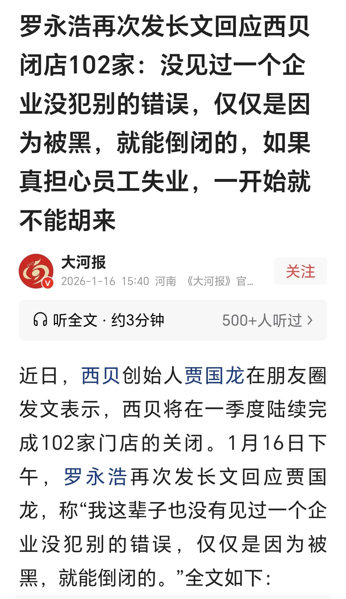 总觉得有点“找茬儿”的意味,没想到老罗还写长文回应了。在将要关闭102家门店之际又提到老罗,还让他道歉,这是不服输啊! 几个月过去了,旧事重提有意义吗? 西贝要关闭102家门店,和老罗有关系吗? 客观讲,有那么一点点关系。 如果没有老罗在几个月前去店里吃那顿饭,他也就不会再饭后吐槽,也就不会发生当时那场“预制菜”风波了。 说白了,这事儿是因老罗而起的。 然而,就算是没有老罗,也可能会有老张、老王或者老李,在一个合适的契机之下,做类似的事,引发类似的关于“预制菜”的热议。 老罗的作用就是提前让这件事发生了,几句吐槽,说出了消费者想说又说不好或者没机会说的话,得到了网友们的共情。 其实,西贝走到今天,不能归咎于老罗多嘴了。 如果西贝运营得好,不管老罗还是老张怎么说,说什么,总不会让一个品牌进入一场公关危机。 网友们的眼睛也是雪亮的,不会无故被别人误导。 另外,在几个月前,那场风波刚开始的时候,贾老板的回应那叫一个硬气呀! 开放厨房,底气十足,结果让网友们大跌眼镜,又是油的问题,又是厨师的问题,等等,又给那场风波继续加油添柴了。 总之一句话,西贝走到今天,岂是外部的质疑或者某个人的言论能左右的? 就没有内部的“人祸”原因吗? 就像有的网友形容得那样,好比两个人吵架,一个人输了,但不服气,过段时间想起来了心里很不是滋味,于是又旧事重提,还想再吵一架,打算找补回来。 贾老板是不是过于意气用事了? 性情中人,不从运营管理方面想办法解决问题,非要去解决引发问题的人,“干老罗”!