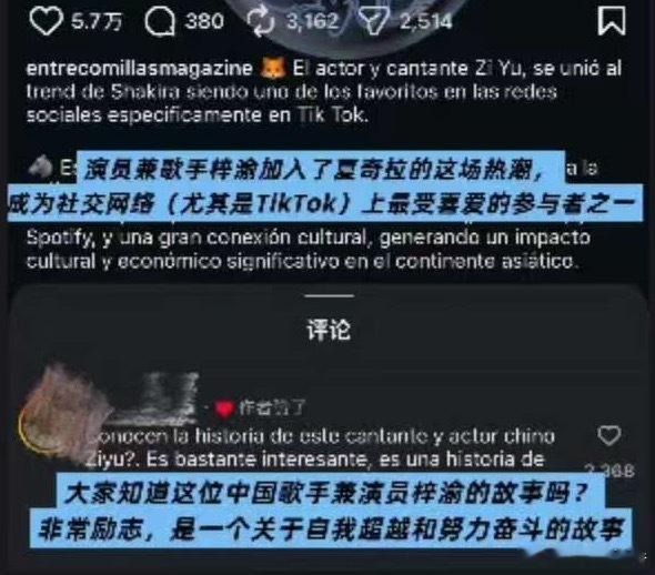 巴拿马知名电台安利梓渝文中写到:演员兼歌手梓渝加入了夏奇拉的这场热潮, 成为社交网络上最受喜爱的参与者之一,大家知道?这位中国歌手兼演员梓渝的故事吗?非常励志,是一个关于自我超越和努力奋斗的故事!海外认可+1!巴拿马知名电台INS强势安利梓渝,实力与魅力征服异国粉丝!!!