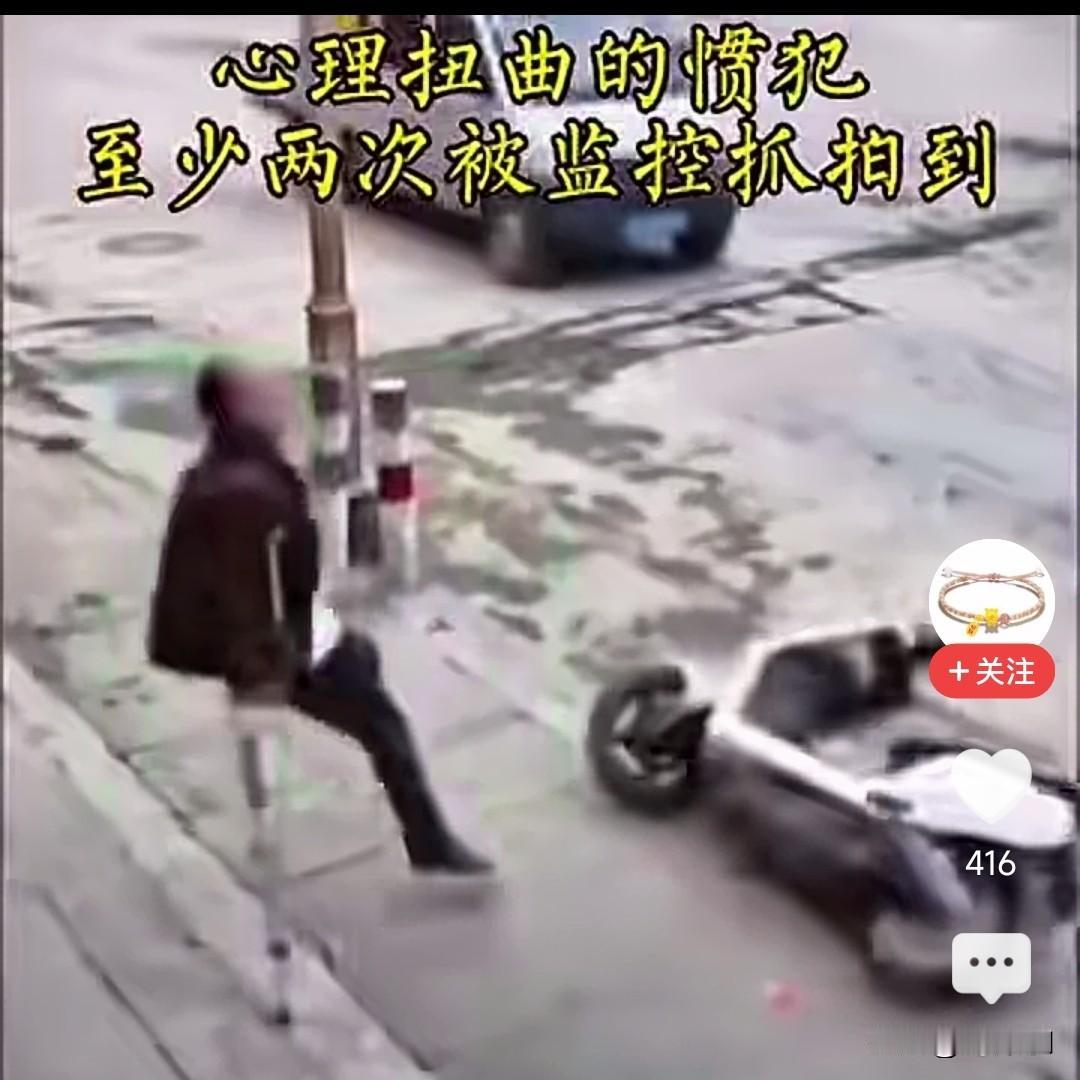 这人都这样了,还这样坏,这是心灵扭曲吗?是什么才让这样的人干这样的事。 看见电瓶车就给踹倒,电瓶车也没挡住你走路,踹人家电瓶车干什么呢?是不是心灵扭曲才让你失去一条腿呢? 好人有好报不知道吗?对别人不好对自己也好不了什么,做人做事凭良心,两次踹电瓶车,给别人造成损失,不心痛吗? 别人的东西不影响你,你干这么缺德的事,不会有好报的,让别人怎么想呢? 网友朋友们你们怎么看这事?