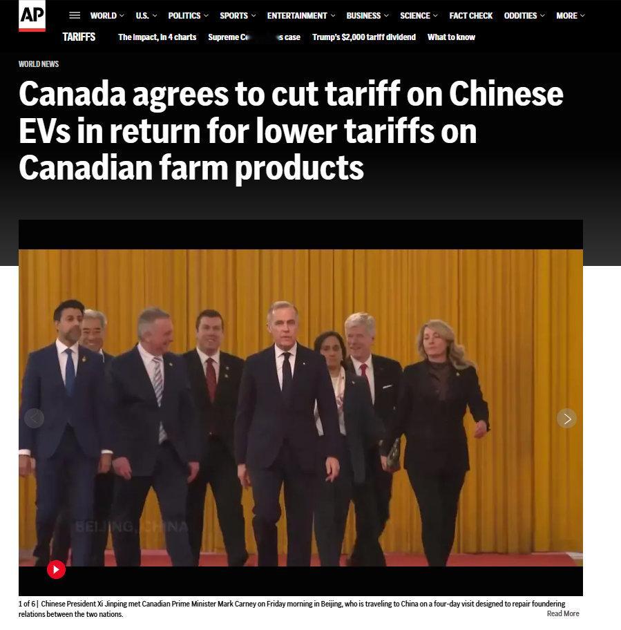 加拿大同中国达成初步协议,恢复允许中国电动车进入加拿大市场。原来加拿大对中国产EV有100%超高关税,但现在决定允许最多 49,000 辆中国电动车/年以约 6.1% 的最惠国税率进口(比之前高得多的税降回正常关税水平)。未来五年还会逐步放宽配额到约 70,000 辆/年。这次是在加拿大总理卡尼访华期间宣布的,被看作是两国在贸易关系上迈出的一步。除了电动车关税放宽,这个协议也包括中国下调对加拿大油菜籽等农产品的关税。电车出海大v聊车加拿大将进口4.9万辆中国电车