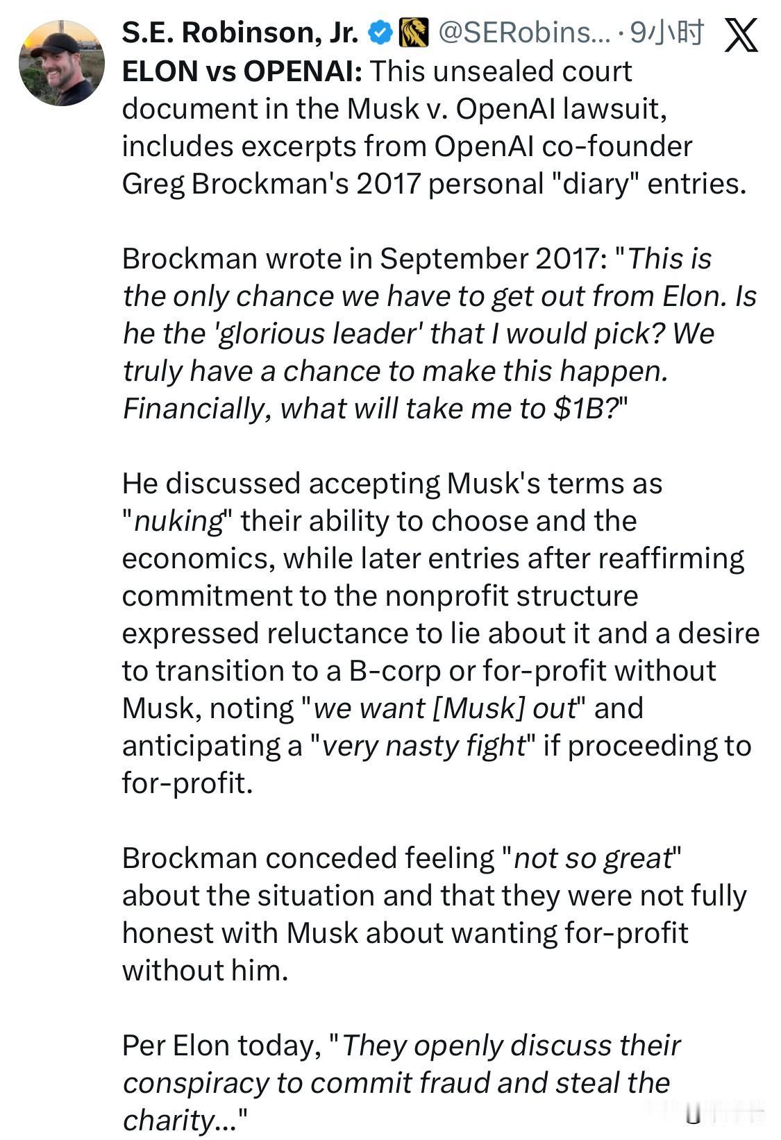 埃隆· 马斯克vs OPENAI:这份在马斯克诉 OpenAI 诉讼案中解封的法庭文件,包含了 OpenAI 联合创始人 格雷格·布罗克曼(Greg Brockman )2017 年个人“日记”的摘录。 格雷格·布罗克曼在2017年9月写道:“这是我们摆脱埃隆的唯一机会。他是我心目中的‘光荣领袖’吗?我们真的有机会实现这个目标。从财务角度来看,怎样才能让我达到10亿美元的目标?” 他讨论了接受马斯克的条件会“摧毁”他们的选择能力和经济状况,而在之后的声明中,在重申对非营利结构的承诺后,他表示不愿就此撒谎,并希望在没有马斯克的情况下转型为 B 型企业或营利性企业,并指出“我们希望(马斯克)退出”,并预计如果继续转型为营利性企业,将会有一场“非常激烈的斗争”。 格雷格·布罗克曼承认他对这种情况感到“不太好”,并且他们没有完全坦诚地告诉马斯克,他们想要在没有马斯克的情况下实现盈利。 据埃隆今天所说,“他们公开讨论了他们密谋实施欺诈和窃取慈善机构资金的计划……”