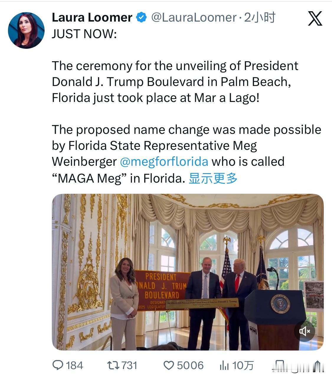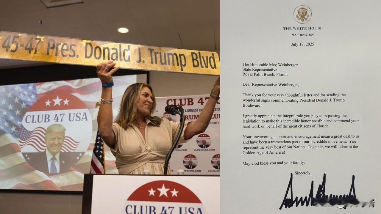 2026年1月16日(周五),唐纳德·J·特朗普总统(Donald J. Trump)在佛罗里达州的海湖庄园(Mar-a-Lago)亲自出席了唐纳德·J·特朗普总统大道(President Donald J. Trump Boulevard)的正式命名与揭幕仪式。 更名的路段全长约4英里(约6.4公里),是南部大道(Southern Boulevard)的一部分,连接了棕榈滩国际机场与海湖庄园。该路段是特朗普往返住所时的常经之路。 揭幕仪式在海湖庄园的“白金大厅”(White & Gold Ballroom)举行。仪式上,特朗普向当地官员表达了感谢,并表示当人们看到这个“漂亮且夜晚发光的标志”时会感到自豪。 此次更名由佛罗里达州共和党众议员梅格·温伯格(Meg Weinberger)发起法案,并于2025年由州长罗恩·德桑蒂斯(Ron DeSantis)签署成为法律。2025年7月,棕榈滩县委员会以7比0的票数通过了具体的命名决议。 出席仪式的嘉宾包括佛罗里达州众议院议长丹尼·佩雷斯、参议院议长本·阿尔布里顿、众议员梅格·温伯格、棕榈滩市长丹妮尔·摩尔,以及特朗普的次子埃里克·特朗普。 尽管设置了仪式性标志,但该路段的官方邮寄地址和急救响应系统仍将继续使用“南部大道”这一名称。 目前,谷歌地图(Google Maps)等在线地图软件已经更新反映了这一新路名
