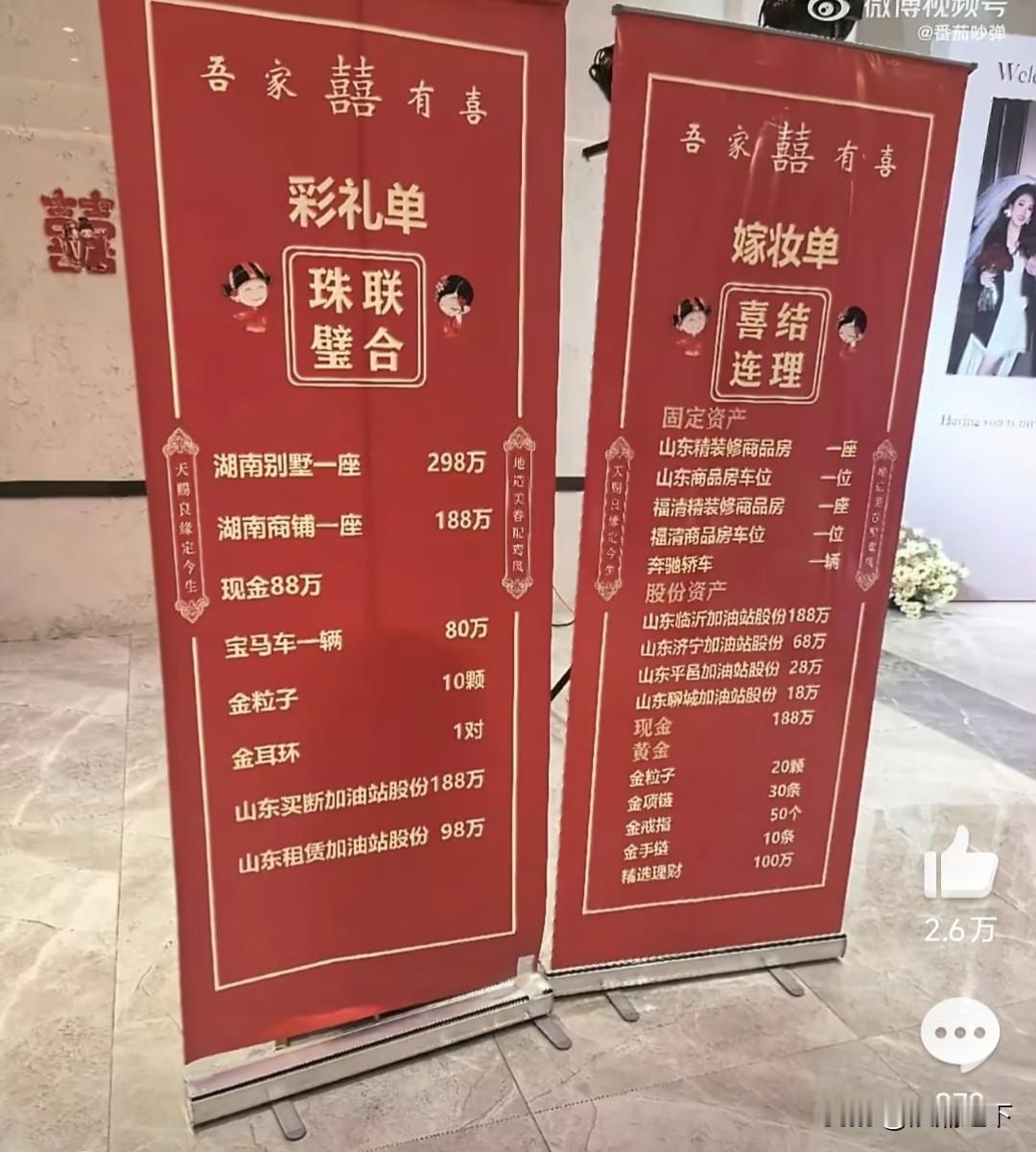 明显女方家实力更雄厚[星星眼]很多地方陪嫁都是比聘礼高的,男方如果加了,女方还得翻着加,准备多少聘礼也得考虑女方跟不跟得上[笑哭]如果女方更雄厚,那得再加一两套别墅。两家是参加加油站加盟会认识的吗[笑哭]? 听福建福清那的朋友说,福建福清这些地方陪嫁就是要远高于彩礼啊,这是风俗! 他俩 烦恼肯定是有的,50个金戒指不知道往哪儿戴哈,俩人加起来手脚并用才40个[吐舌],光加油站股份女方就赢了,男的连宝马都写上价格了! 听说福建人一个村的亲戚朋友一起承包加油站的多了去了,了解一下就知道了,90%私人加油站都是福建人,所以暴富…