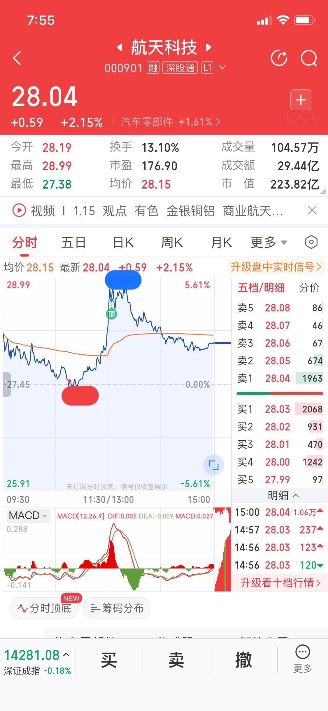 (1)做T,1月17日下周商业航天板块会迎来反弹,尤其越临近周五会有资金抢筹,因为下下周一航天核心票会出监管,所以下周以震荡上涨为主。如何在行情爆发前自我解套,必须学会做T,做T分为正T低吸高抛,反T高抛低吸,前提手里有持仓。做T有两个小技巧,第一是均价线,股价围绕均价线上下波动,股价突然偏离均价线太多做T好机会。拿周五航天科技来举例,红色点位股价急速下跌偏离均价线,是个好买点,蓝色点位快速偏离均价线是个好卖点,低吸高抛有5个点的收益,新手朋友每次做T有三个点利润就算成功了,慢慢训练,做T成功降低成本,自我解套。