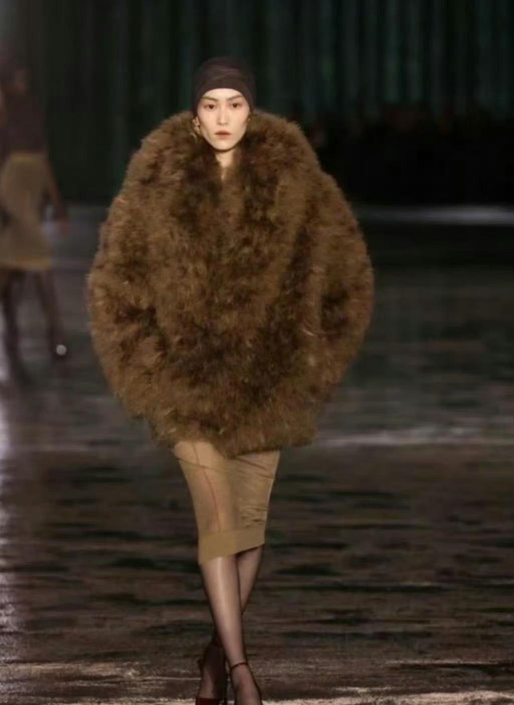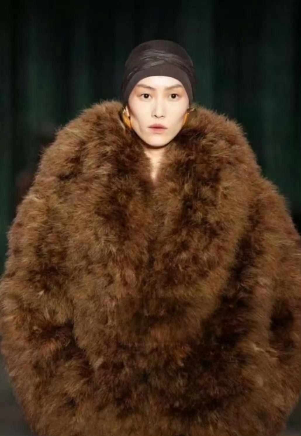 刘雯在巴黎时装周的这组造型,把“反差感”玩明白了! 超大廓形的皮草外套自带气场, 搭配极简的包臀裙和黑丝, 看似“看不懂”的夸张剪裁, 其实是高级感拉满的先锋表达。