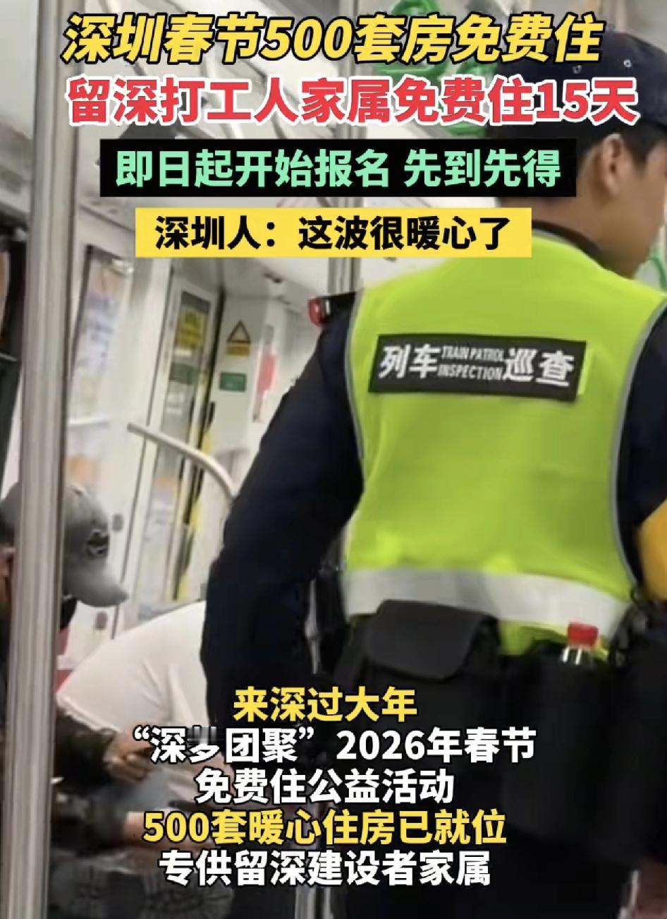 深圳推出2026年春节500套房免费做公益活动,即日起即可报名,房子专给留在深圳深圳打工人家属住15天。在深工作的快递员,网约配送员,网约车司机,货车司机四类新就业群体,保障房建筑工人,公交车司机,地铁一线运营服务人员等。也有很多网友说出了自己的心声,希望深圳的房租能够降一点,对于我们普通打工人来说,就是最暖心的补贴。 在春节期间保障城市运行的城市建设者