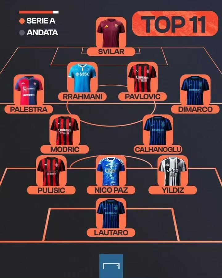 意甲最佳,米兰双雄占一半! 根据外媒爆出的意甲半程最佳阵容,米兰双雄占据6席。其中米兰这边有帕夫洛维奇、普利西奇和莫德里奇,国米这边有迪马尔科、恰尔汗奥卢和劳塔罗,这也刚好和意甲积分榜前两位的排名相呼应。