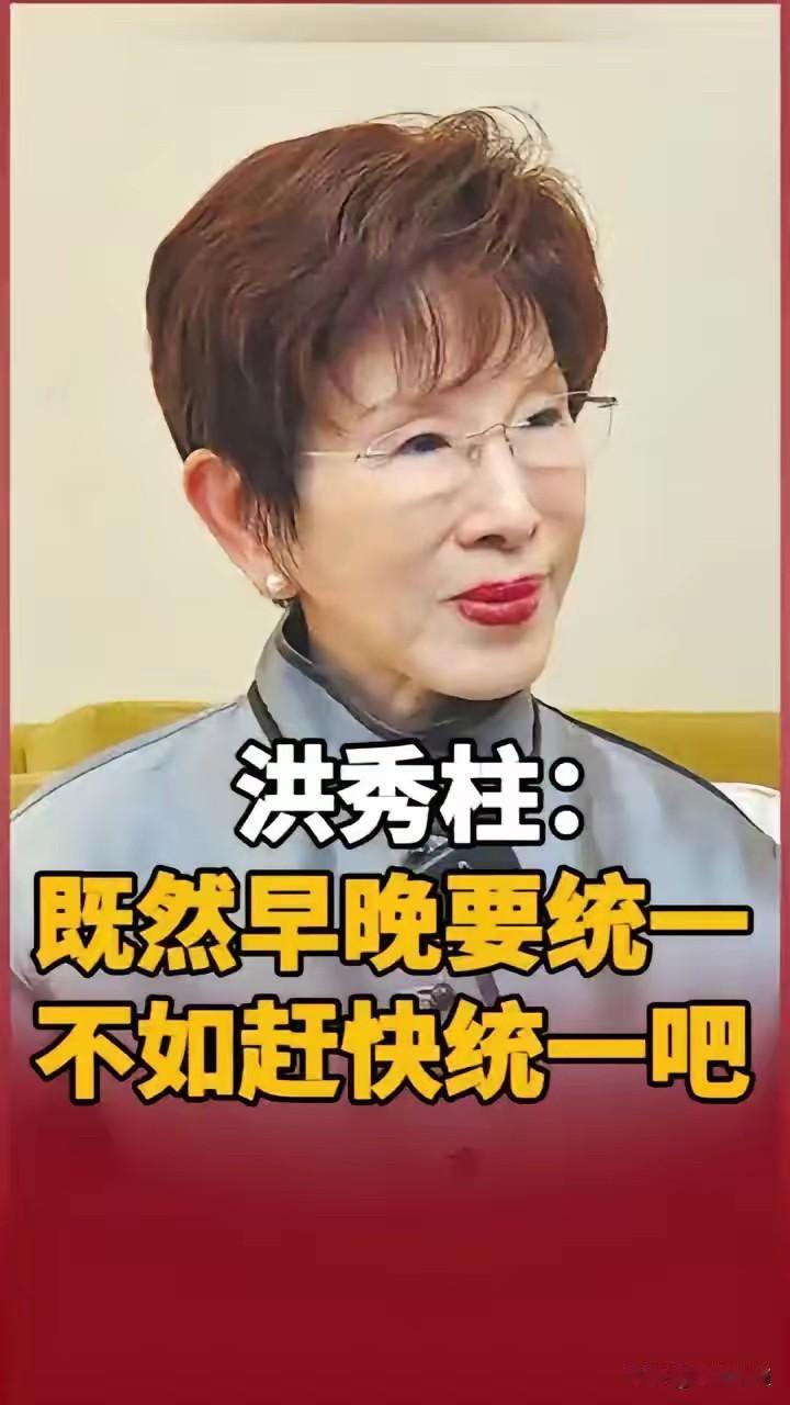 洪秀柱等台湾统派等不及了,直接催促大陆“赶快统一吧”“宜早不宜迟”,免得台湾老百姓继续受民进党蹂躏,继续受苦! 洪秀柱这次表态太急迫了!直接喊大陆赶快统一,说这事宜早不宜迟。 就是不想让台湾老百姓再受民进党折腾,跟着遭罪。 她还劝国民党,别回避统一的事。光反对“台独”不够,还得主动促进统一。 最近采访时,洪秀柱说得很实在。 她说中国发展越来越旺,两岸统一肯定不远了。 “既然早晚要统一,不如赶快统一”,这话说到了大家心坎里。 现在赖清德当局让台湾老百姓很无奈,只有统一才能让大家过上安稳日子。 统一是历史大势,也是大家心里都盼着的事。 洪秀柱心里特别有底,觉得统一已经近在眼前,不是遥不可及的梦。 有网友说,大陆也一直努力,不想看到有人受伤,只想和平统一。 她还呼吁台湾所有支持统一的同胞,都团结起来。 大家各尽所能,一起抵制“台独”,为祖国统一出份力。 笔者认为,祖国统一是所有中华儿女的心愿,这一天肯定会来! 有这么多统派同胞一起努力,统一的脚步只会越来越快,太让人期待了! 对此,你怎么看呢?