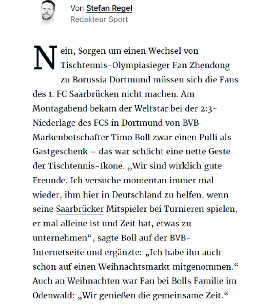 樊振东莫雷加德首次共同出战 萨尔布吕肯的球迷们不用担心,樊振东并不会转会至多特蒙
