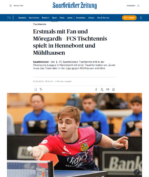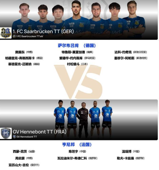 樊振东莫雷加德首次共同出战 萨尔布吕肯的球迷们不用担心,樊振东并不会转会至多特蒙德。在周一晚萨尔布吕肯客场 2:3 不敌多特蒙德的比赛后,这位世界级球星的确是从多特蒙德品牌大使蒂姆・波尔手上接过了一件球衣—— 但只是作为赠礼,只是来自乒坛传奇波尔的一番友好举动罢了。 萨尔队员周四乘车前往图林根州(穆尔豪森主场),与穆尔豪森这场联赛一结束,球队就得连夜赶回萨尔布吕肯,周六清晨再奔赴法国,客场挑战亨尼邦俱乐部,开启欧冠四分之一决赛首回合较量。对手的阵容除法国运动员西蒙・高茨之外,还有三名中国球员陈垣宇(世排23)、周启豪(世排36)、温瑞博(世排53)。目前不清楚亨尼邦会派出哪些球员。 奥运亚军莫雷加德也将加入萨尔布吕肯的欧冠阵容。他需要出战两场欧冠赛事,才能获得在萨尔兰体育馆举办的欧冠决赛阶段的参赛资格。尽管对手实力强劲,但萨尔布吕肯拥有奥运冠亚军樊振东与莫雷加德这对组合,两人首次共同身穿萨尔布吕肯球衣出战。1月19号期待樊振东,期待萨尔布吕肯!