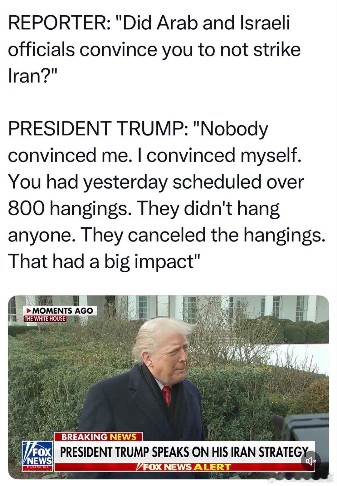 记者:是阿拉伯国家和以色列官员,说服你不要打伊朗吗总统:没人能说服我,只有我能说服自己…昨天他们原计划绞死八百多人,结果没有,取消了,这有很大影响