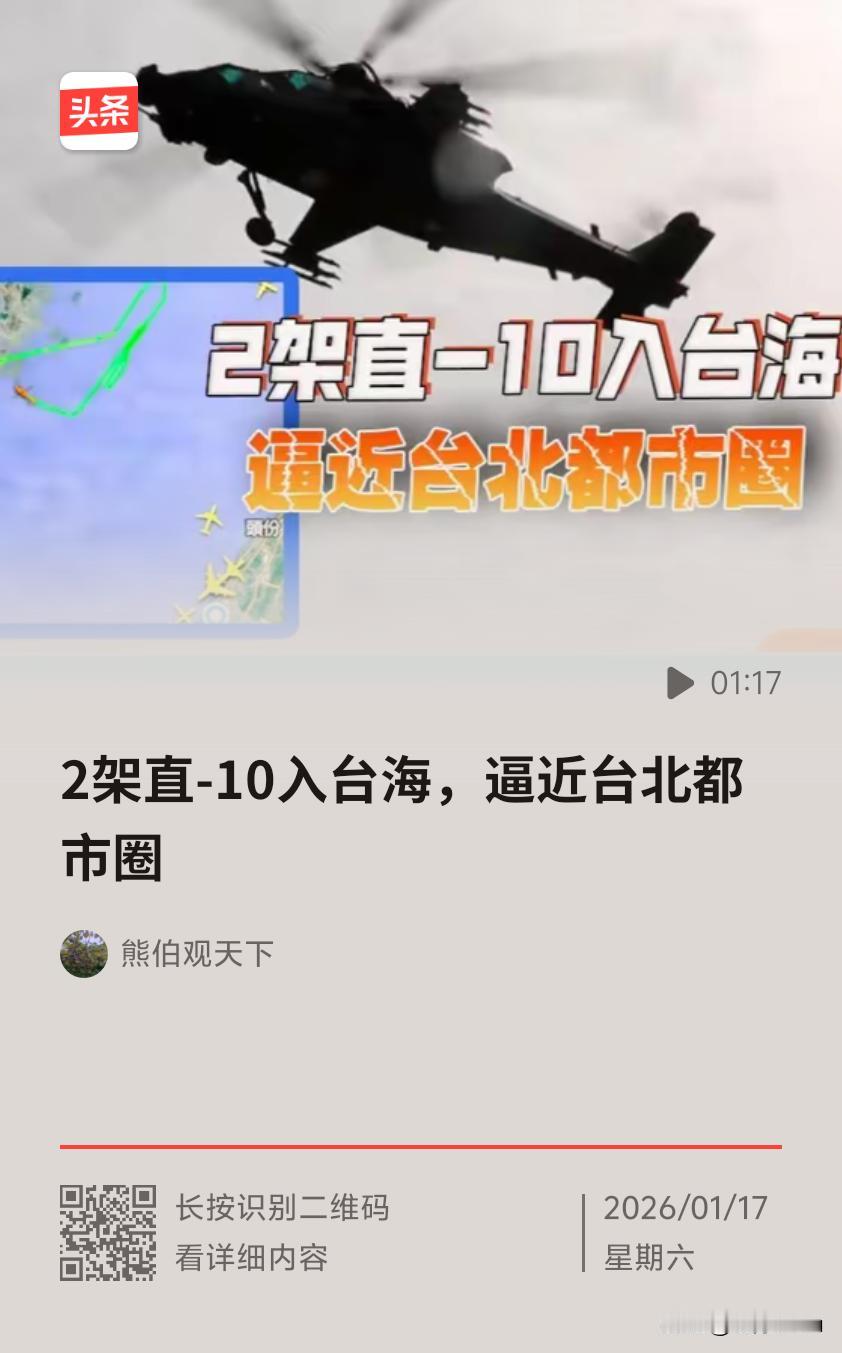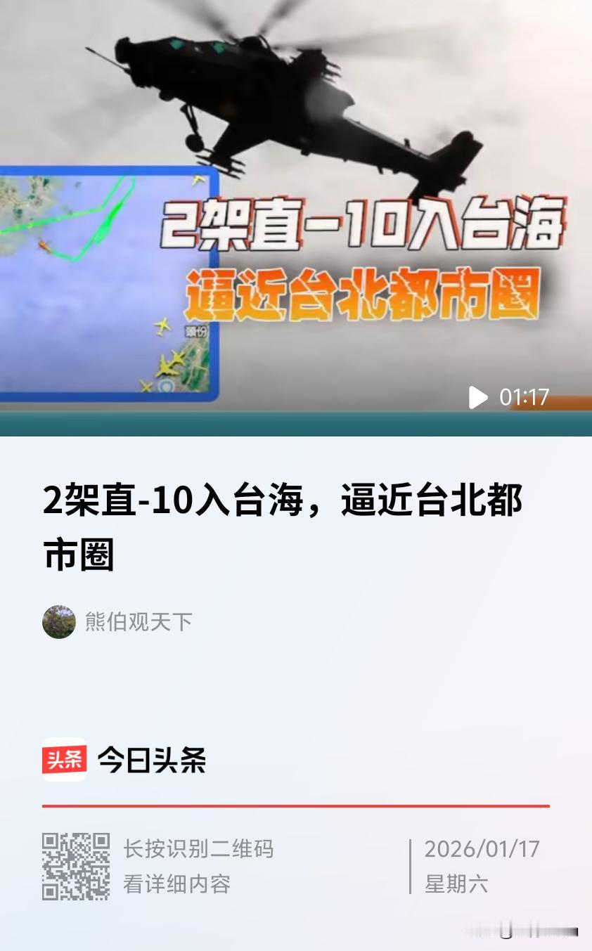 据岛内媒体报道,1月16日中午11点38分,2架解放军直 - 10直升机开启“广播式自动相关监视”(ADS - B),逼近台湾北部桃园、新竹外海,威胁到台北都市圈。台媒认为此次行动震慑意味浓厚,结合过往解放军类似军事行动,可能传递以下信号: 展示作战能力 直 - 10是攻击直升机,有对地压制能力,可搭载特种作战部队。若对台“外离岛”发动突袭夺岛作战,它会是重要战力。此次逼近台北都市圈,展示了解放军有能力将其运用到对台军事行动中,对“台独”势力形成军事威慑。 彰显主权与管控能力 台北是台湾核心区域,2架直 - 10逼近表明解放军有能力对台岛全域进行管控。这是对中国主权和领土完整的有力捍卫,说明在自家领土周边行动正当合法,“台独”势力划定的所谓界限无效。 常态化战备宣誓 此前一天,东部战区刚进行今年首轮“联合战备警巡”,34架次军机搭配12艘舰船在台湾周边活动。此次直 - 10行动是连续军事活动,彰显解放军全年保持战备状态,随时能应对各类突发状况,警告“台独”势力不要轻举妄动。