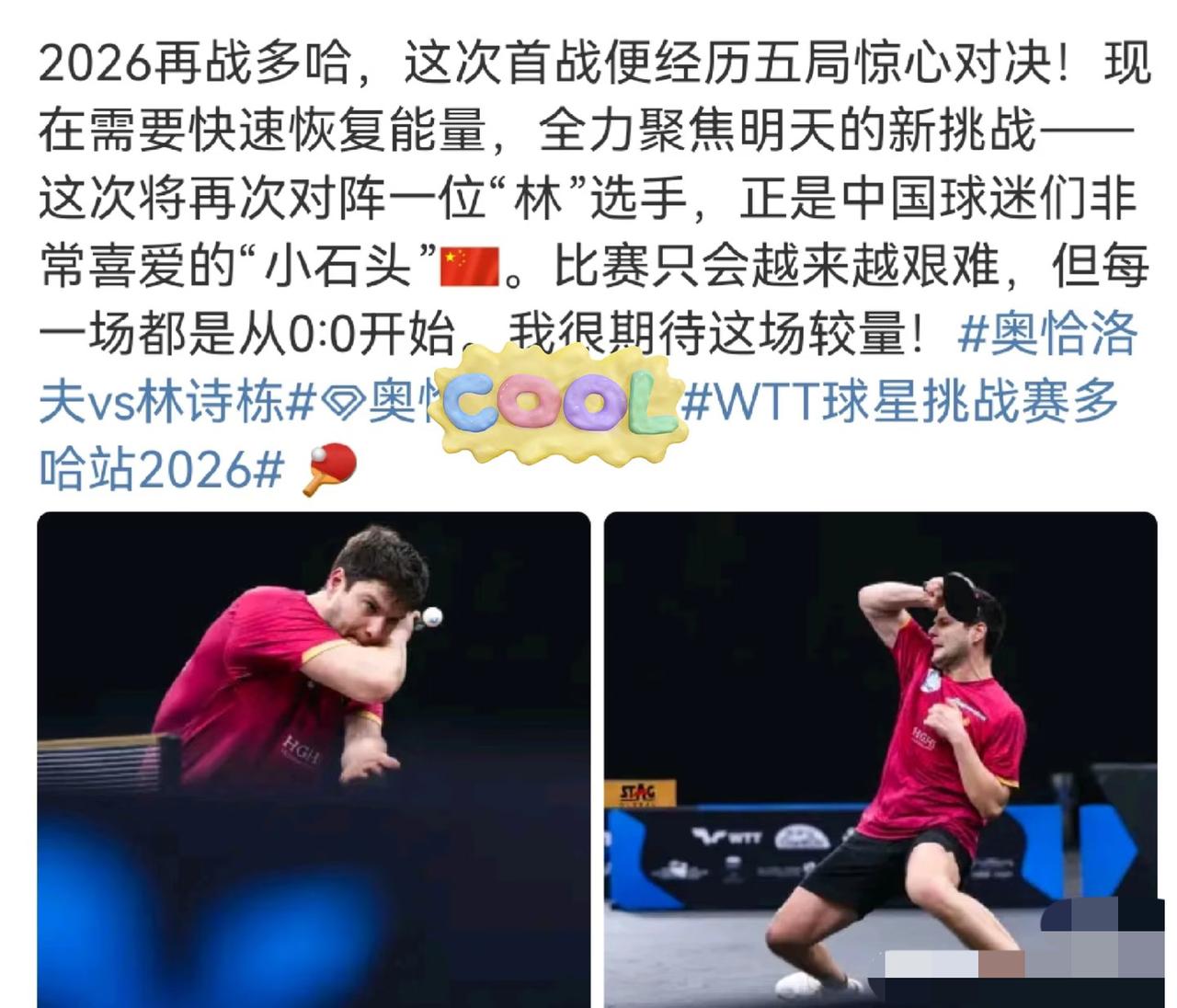 奥恰洛夫更新:2026再战多哈,对阵中国球迷非常喜爱的小石头! 1月17日,奥恰洛夫发文: 再战多哈, 首战就经历了五五局的惊心对决, 现在需要尽快恢复能量, 全力聚焦明天的新挑战, 对阵一位姓林的选手, 正是中国球迷非常喜爱的小石头, 比赛会非常艰难, 但一切都是从零开始, 我期待着这场较量! 奥恰洛夫在首轮比赛中 苦战5局打败赵大成, 1月17日,今天下午17:45 林诗栋VS奥恰洛夫, 林诗栋加油! 看来奥恰知道林诗栋叫小石头啊哈哈哈!