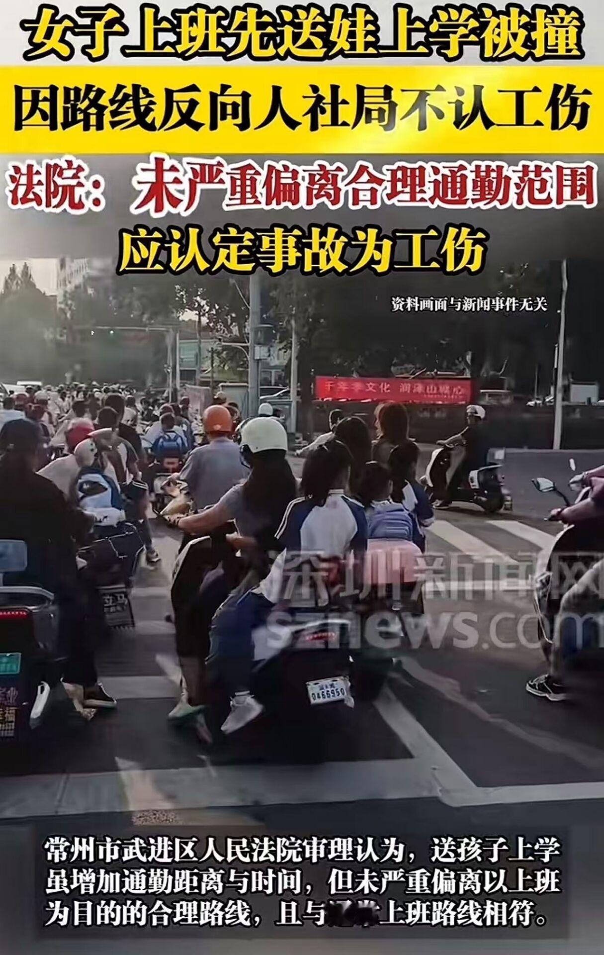 “这才是法院该有的样子!”女子上班途中先反方向送娃被撞,申请工伤遭人社局驳回:“和上班方向相反,不算工伤!”女子不服,上诉至法院,法院判决让网友炸锅! 陈女士怎么也没想到,自己只是像千千万万普通妈妈一样,早上送孩子上学后再去上班,竟会因为一场车祸,被推入一场“是不是工伤”的拉锯战——而最初,她连最基本的权益都被一句轻飘飘的“路线反了”给否定了。 2024年10月8日清晨6点38分,天刚蒙蒙亮,陈女士像往常一样骑着电动车,先送孩子去学校。 孩子的学校和公司在两个方向,为了兼顾家庭和工作,她每天都要绕个大圈:先送娃,再折返去上班。 这天,在送孩子的路上,一辆普通客车突然变道,将她撞倒在地。 她当场昏迷,被紧急送往医院。诊断结果触目惊心:创伤性脾破裂、左手第四掌骨骨折、S5腰骶椎骨折,还有左肾挫伤伴血肿。 所幸交警认定:客车司机全责,陈女士无责。 但20天后,陈女士向当地人社局申请工伤认定时,却收到了一纸《不予认定工伤决定书》。 理由冷冰冰:“你送孩子走的是反方向,不属于上下班合理路线,不算工伤。” 那一刻,陈女士委屈得几乎说不出话。 她不是偷懒、不是绕路逛街,而是作为一个母亲,在尽最朴素的责任——送孩子上学。难道就因为路线“不直”,她的伤痛就不算数?她的付出就不被看见? 她不服,毅然提起行政诉讼。 法院没有让她失望。 一审法院明确指出:“上下班途中”从来不是一条僵化的直线。现实中,职工为了生活需要——比如接送孩子、买菜、顺路办事——选择不同路线,完全符合常理。只要最终目的是上班,且时间、路线在合理范围内,就应被纳入工伤保障范畴。 法官特别强调:陈女士上班时间是7点,事故发生在6:38,属于合理通勤时段;虽然送孩子让路程变长,但并未严重偏离以“上班为目的”的合理路径,且这是她长期固定的日常安排。 于是,法院果断判决:撤销人社局的不予认定决定,责令重新处理! 公司不服,提起上诉,坚称“南辕北辙不能算顺路”,还说这种绕行“增加了风险”,不该算工伤。 但二审法院毫不动摇,驳回上诉,维持原判——用法律为一位普通母亲撑了腰。 此事引发热议,有网友说,我感觉不算工伤,如果是上班同一路线,顺路送娃,应该认定为工伤,这个明显是在送娃路上出的事故,不是上班的路上。 也有网友说,大家也别抬杠,举一个极端一点的例子比如上班路上,我天天绕个弯,跑公司前面一公里的商铺买早点,因为很好吃。但是在等红绿灯被撞了,对方机动车全责。这也是工伤。这就属于日常生活所需活动,合理时间,合理路线的法律条款! 还有网友说,法院明智之举!虽然,反方向送娃,但,最终目标是,送完娃,要去上班,这个过程都属于:上下班的途中!因为出现过,上下班途中绕菜市场买菜发生事故,判定为工伤的案例!所以,这个判决很公平公正!因为不是所有的菜市场,都在上班的顺路上,同理,不是所有的学校,都在上班的顺路上! 我认为,这不仅是陈女士的胜利,更是对千万职场父母的温柔守护。 当一个社会开始用“路线是否笔直”来衡量一位母亲的付出是否值得被保护,那才是真正的“走偏了”。 法院的判决之所以令人拍手叫好,不仅因为它依法办事,更因为它看见了生活的真实模样——带娃、赶车、绕路、早起……这些琐碎,正是普通人生活的底色。 工伤保险的意义,不是奖励完美通勤,而是兜住那些在生活与责任之间奔波跌倒的人。 感谢法院没有用冰冷的条文碾碎人间烟火,而是用理性与温度,告诉每一位负重前行的劳动者:你的辛苦,国家看得见;你的伤痛,法律护得住。