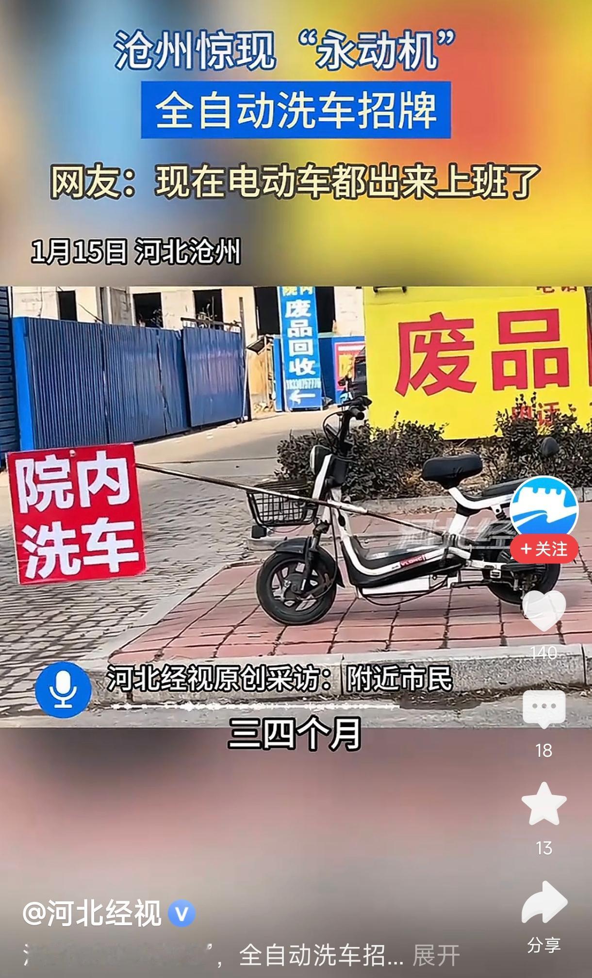 电动车都出来上班了 这段话看起来像是在描述一个有趣的现象或网络热议的话题。具体来说: “河北经视”:可能是指河北经济广播电视台或相关媒体。 “沧州惊现‘永动机’,全自动洗车招牌”:描述在沧州发现一个全自动洗车设备,网友戏称它为“永动机”,暗示设备运行得非常顺畅或神奇。 “网友:现在电动车都出来上班了”:这句可能是在调侃或幽默地表达,暗示这些自动洗车设备“自己工作”或“自己动起来”,像是电动车“出来上班”一样,带有拟人化的意味。 整体来看,这是一则带有幽默色彩的网络话题,借用“永动机”和“电动车上班”的比喻,表达自动洗车设备运行顺畅或智能化的趣味场景。上班自行车 上班单车
