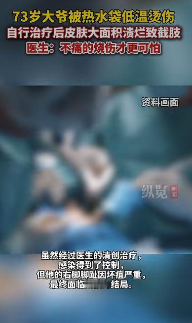 73岁的老大爷,就因为冬天用热水袋捂脚,结果脚趾头被烫伤,最后竟然发展到要截肢。这事儿听着离谱,可背后藏着不少容易被忽视的健康隐患,咱们得好好说道说道。 这位大爷患糖尿病十多年了,平时血糖控制得不太好。冬天冷,他睡前就把热水袋塞进被窝捂脚。有天晚上,他迷迷糊糊睡着了,热水袋贴着脚趾头放了一整宿。第二天早上起来,发现脚趾头起了个大水泡,可他没当回事,自己用针挑破了,随便抹了点药膏。没想到,这水泡破了之后,伤口越来越严重,没几天脚趾头就发黑溃烂,还流脓发臭。家人赶紧送他去医院,医生一看,说这是糖尿病足合并严重感染,脚趾头已经坏死,只能截肢保命。 为啥一个热水袋能闹出这么大的事儿?关键就出在糖尿病上。糖尿病患者长期高血糖,会损伤两条“生命线”:一条是神经,导致脚麻、没感觉,就像戴了层厚手套,热水袋烫着都不知道疼;另一条是血管,让脚上的血液流通变慢,伤口愈合能力差。大爷的脚趾头被烫伤后,神经病变让他感觉不到疼,血管病变又让伤口没法愈合,细菌趁机“安营扎寨”,最后把脚趾头“啃”坏了。 其实,像大爷这样的悲剧不是个例。有位40多岁的糖尿病患者,冬天用电热宝暖脚,结果大脚趾被烫出硬币大的水泡,他也没在意,结果伤口感染,最后不得不截掉大脚趾。还有位63岁的老人,睡觉用热水袋捂脚,第二天发现脚趾头烂了两个洞,送医后发现趾骨都坏死了,最后也截了趾。这些案例都说明,糖尿病患者用热水袋、暖宝宝这些取暖工具,风险比普通人高得多。 那冬天该怎么安全取暖呢?对糖尿病患者来说,最好别用热水袋、暖宝宝直接贴皮肤,电热毯也别开整晚,睡前开一会儿,上床就关掉。如果实在怕冷,可以用温水泡脚,但水温别超过40℃,时间别超过20分钟,泡完赶紧擦干,尤其是脚趾缝。平时要每天检查脚,看看有没有破皮、水泡,哪怕是小伤口也别忽视,赶紧找医生处理。 这事儿也给咱们提了个醒:健康不是小事,尤其是家里有糖尿病、高血压或者血管不好的老人,冬天取暖一定要多留个心眼。别看热水袋、暖宝宝小小的,用不好真能酿成大祸。咱们得把“温暖”和“安全”都抓在手里,这样才能过个暖乎乎的冬天。 来源:纵览新闻