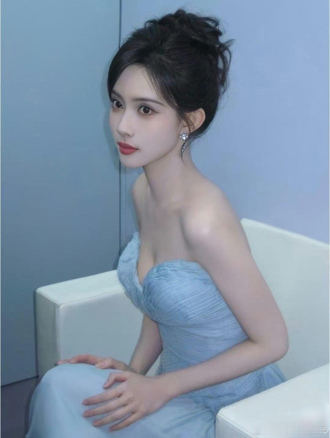 孟子义穿一袭蓝色抹胸裙,这个肩颈线条肤白貌美的大美人!