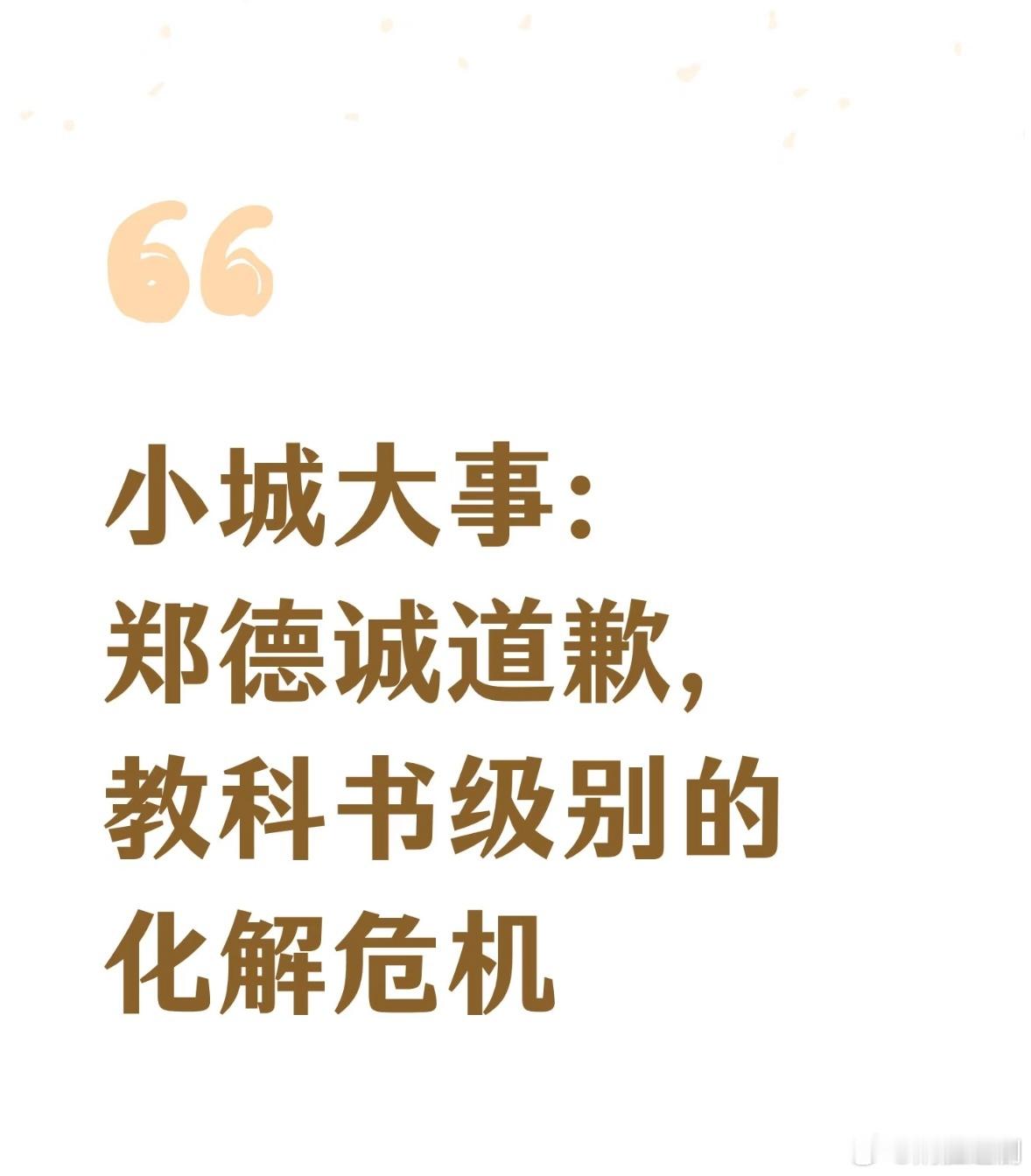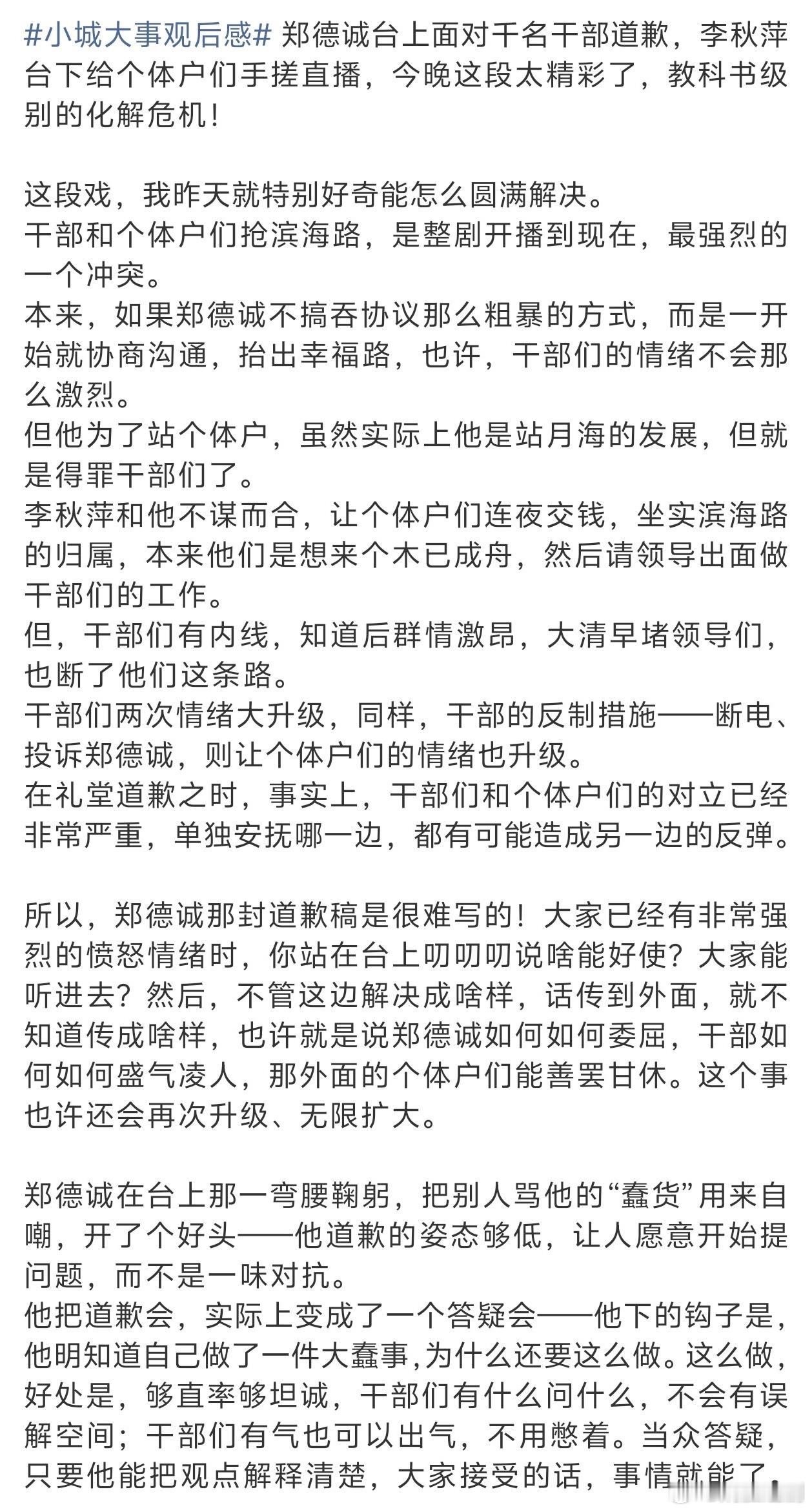 小城大事 这段道歉戏挺好的。郑德诚道歉和李秋萍小纸条转播双线并行,没有通过硬煽情,只是真诚地举例子讲事实,通过通过道歉和答疑安抚双方情绪,成功化解危机👍小城大事后劲