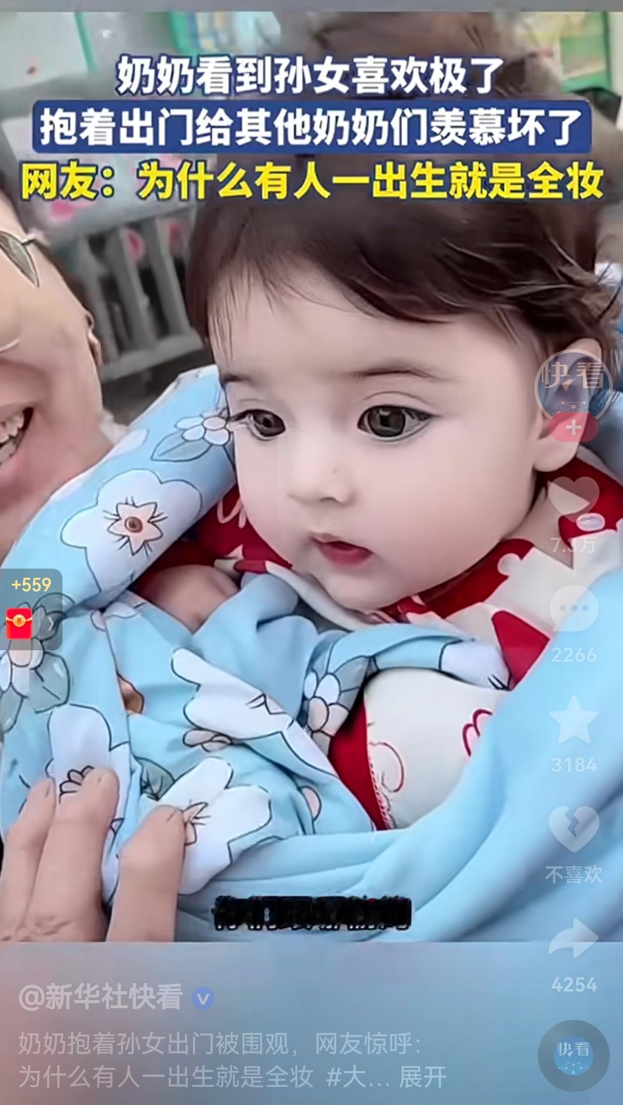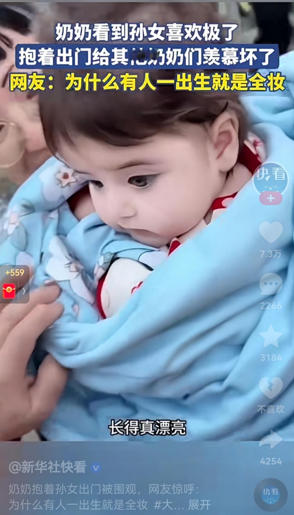 哎呀,妈呀!长得太稀罕人了!近日,一奶奶带孙女出门的视频真的是羡善旁人。 视频里,奶奶抱着小孙女在小区里玩耍,刚到小区就被一群奶奶围了上来,大家你一句我一句,把奶奶夸得合不拢嘴。 视频中,这个刚出生不久的小孙女,长着一双水汪汪的大眼睛,棕色的头发,皮肤白里透红,活脱脱地像个洋娃娃。 网友们看完纷纷惊呼:“为什么有人一出生就是全妆?这颜值也太能打了!” 其他奶奶们看到了,真的是羡慕坏了,围着孩子一直夸个不停,有人开玩笑说:“这孩子是不是偷来的?怎么能长得这么好看!” 看完这个视频,我心都被萌化了在奶奶的眼里,自己的孙女就是全世界最漂亮的孩子。在这些围观的奶奶们眼里,这不仅是一个可爱的宝宝,更是对“隔代亲”最好的诠释。 我们总说“隔代亲”,其实亲的不是血缘,是奶奶把对子女的爱,又加倍给了孙辈。是看着孩子一点点长大,仿佛自己又重新活了一次。 奶奶对孙女的这份宠爱,没有任何条件,只因为你是我的孩子,是我捧在手心里的宝贝。