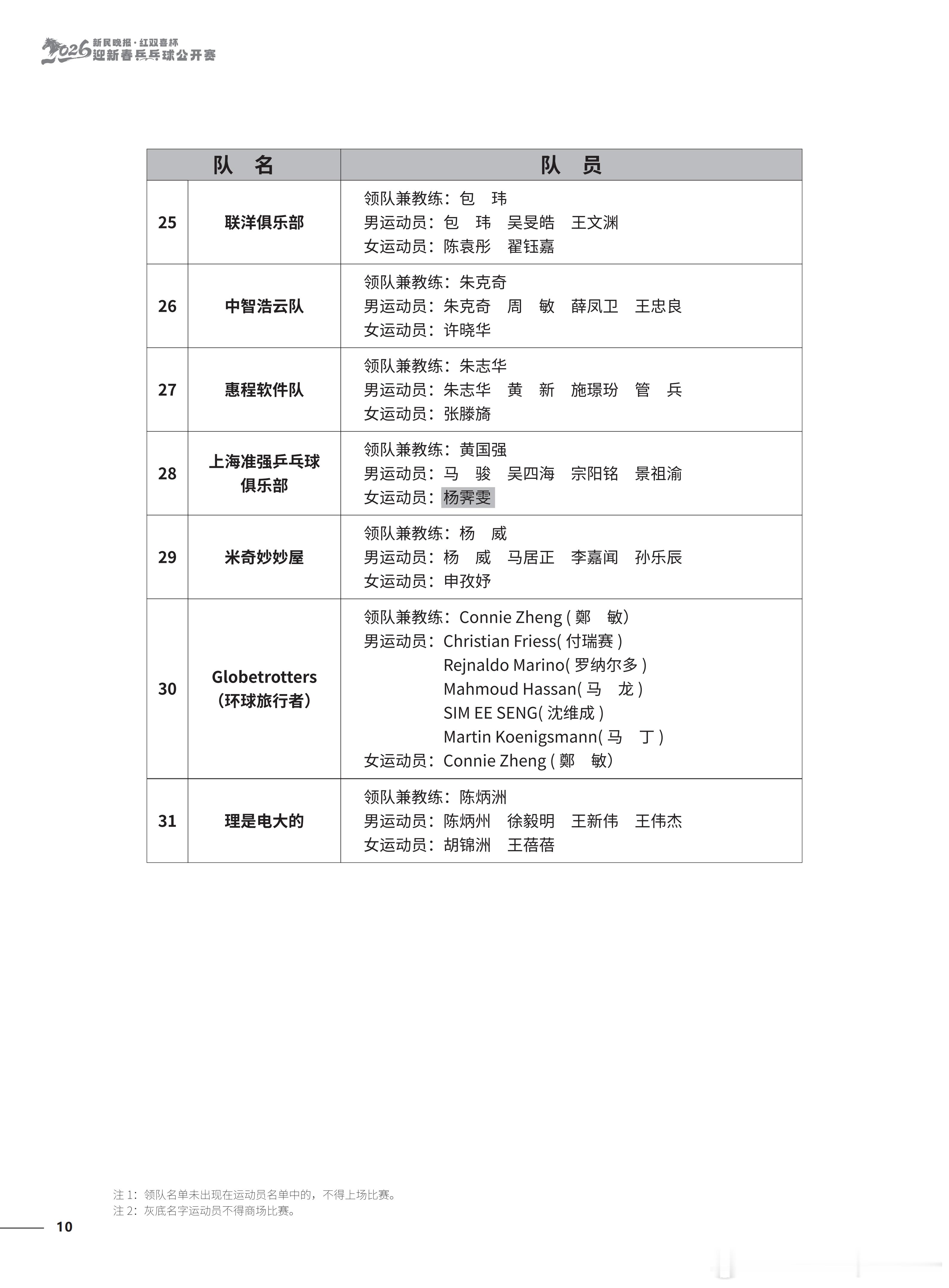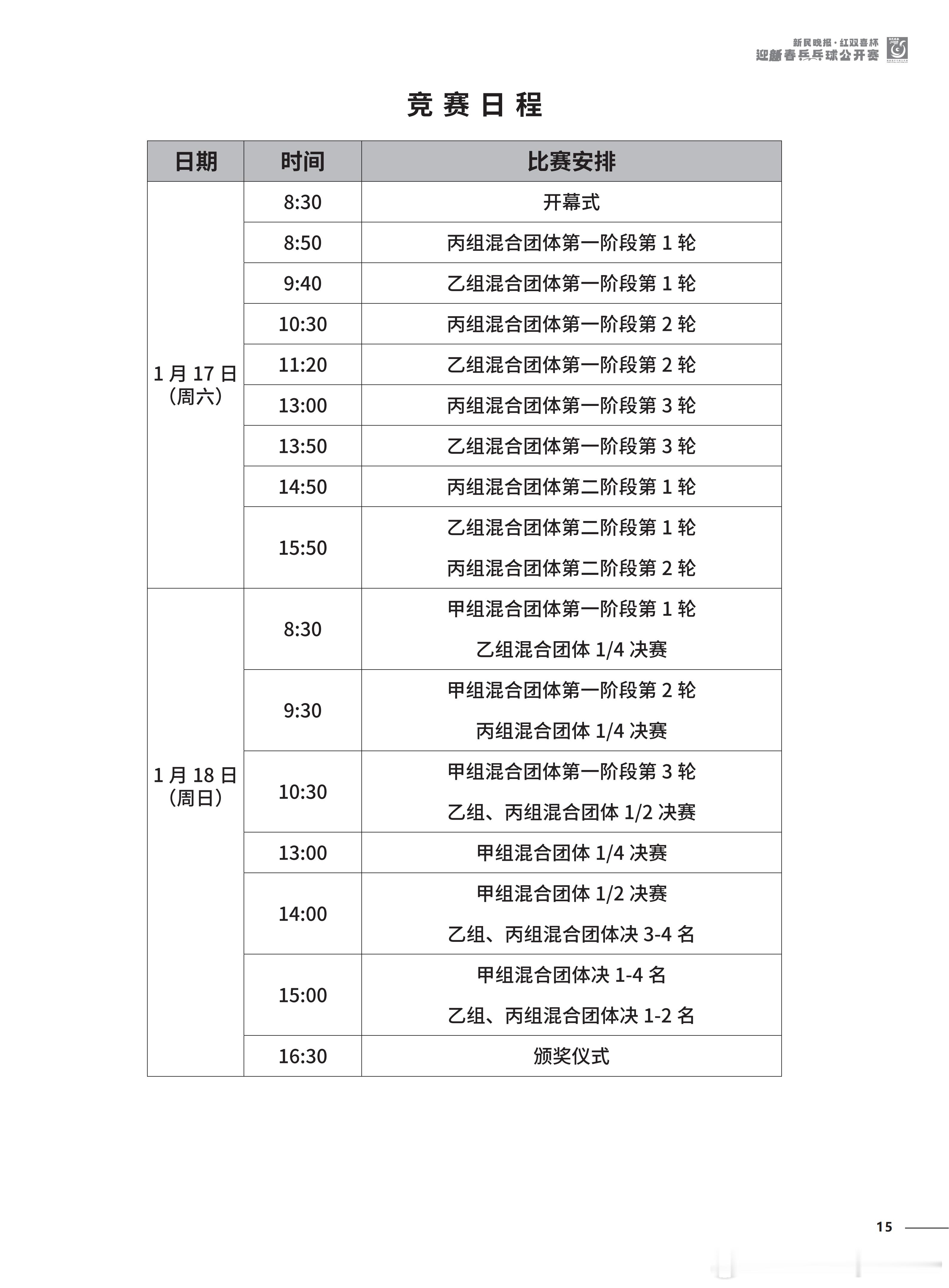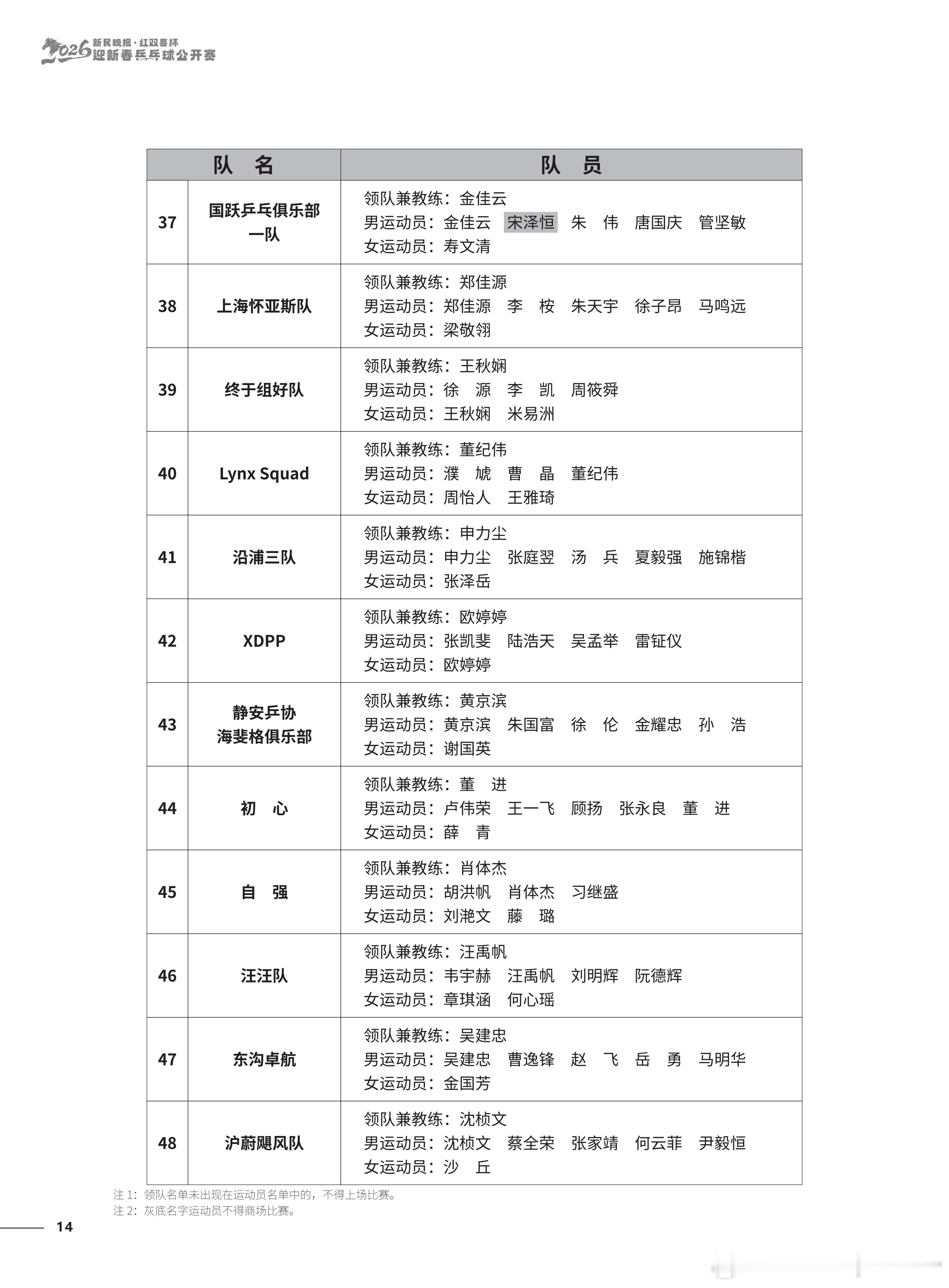 2026“新民晚报红双喜杯乒乓球公开赛”今天开幕 参赛名单及竞赛日程锡纳泰克领队兼教练:刘诗雯男运动员:习胜 夏易正女运动员:刘诗雯 臧小桐 孙艺祯 车晓曦沿浦一队领队兼教练:王博男运动员:王博 魏世皓 于何一女运动员:刘炜珊 李仁思佳 赵尚
