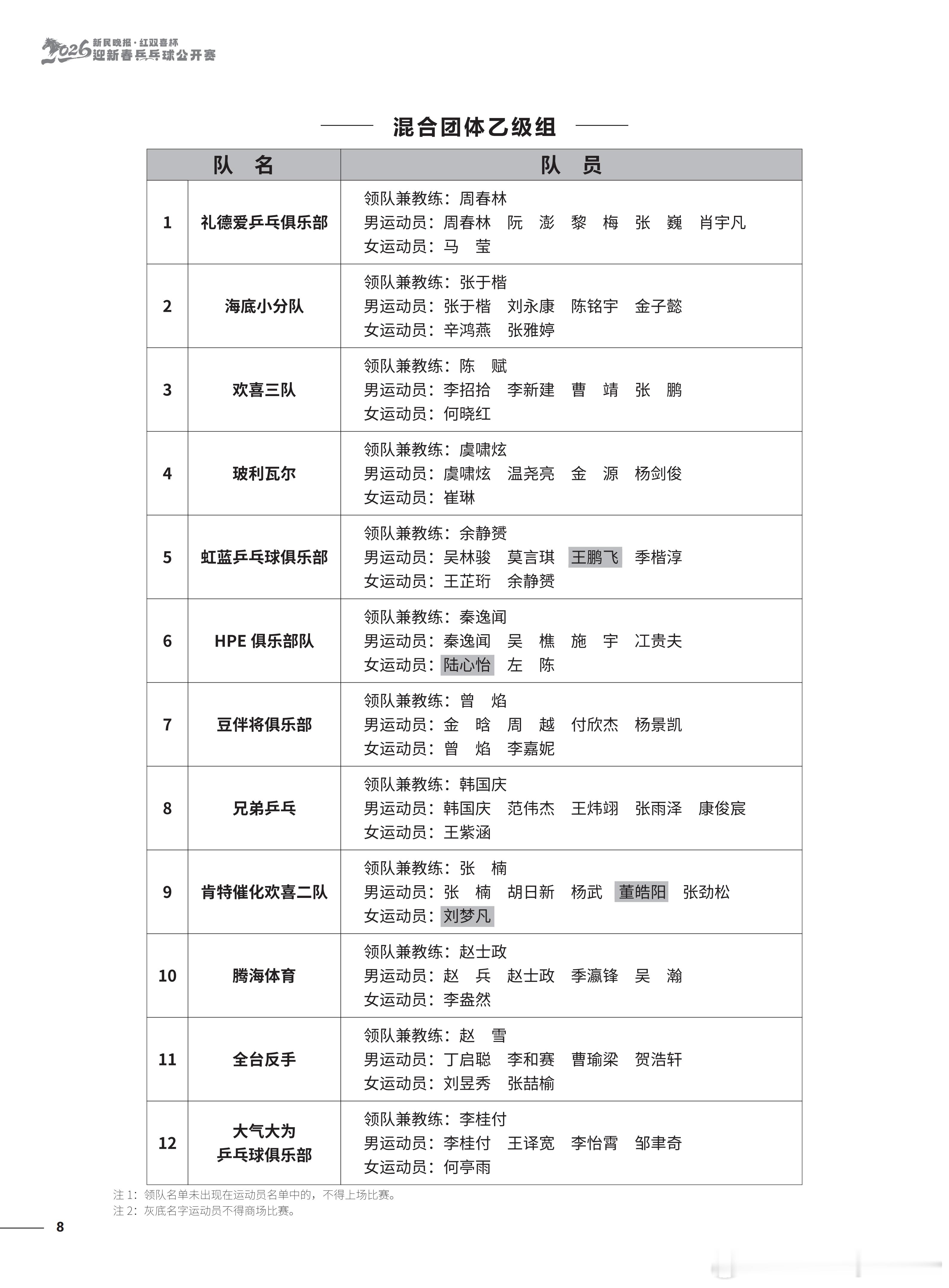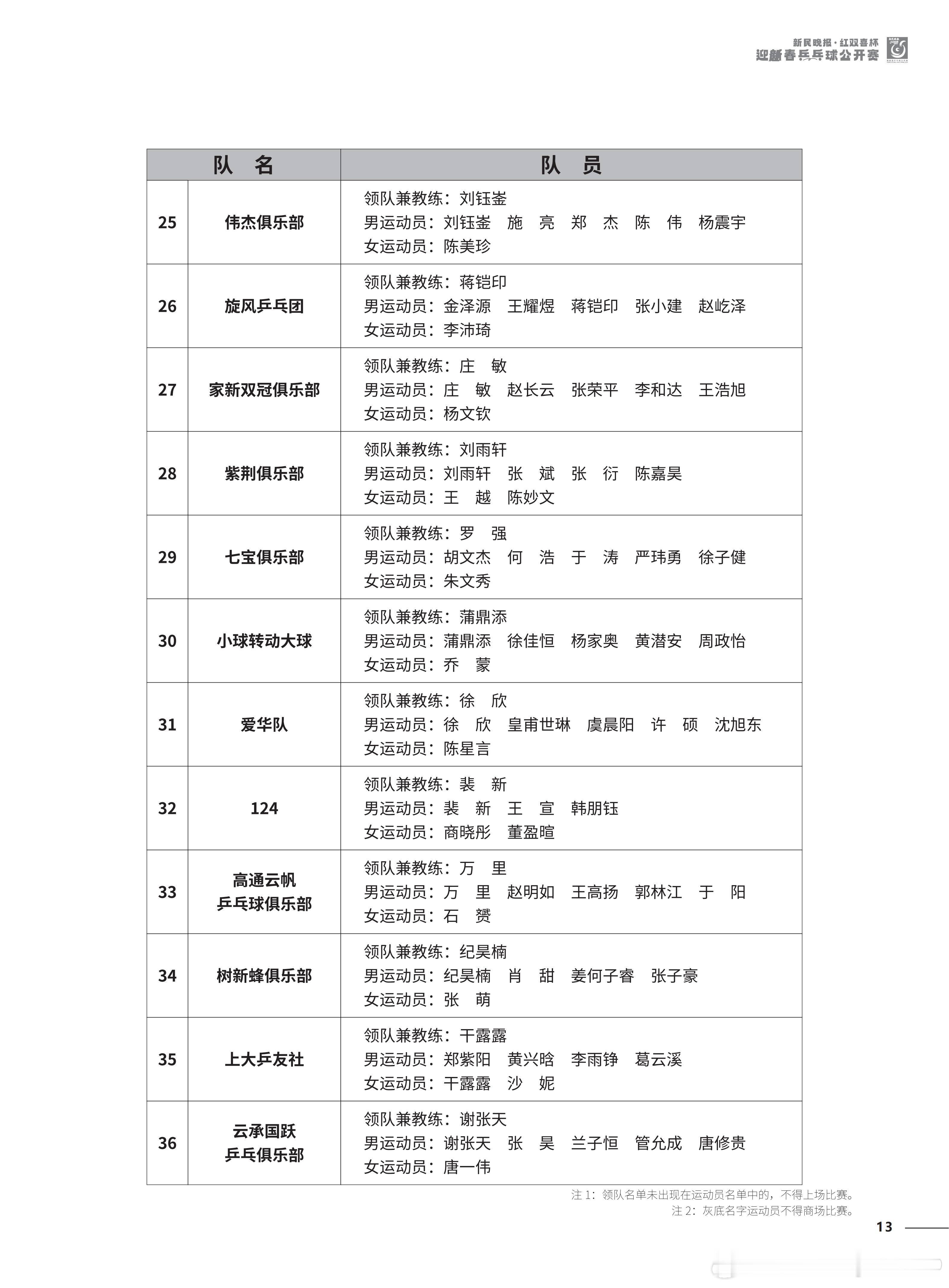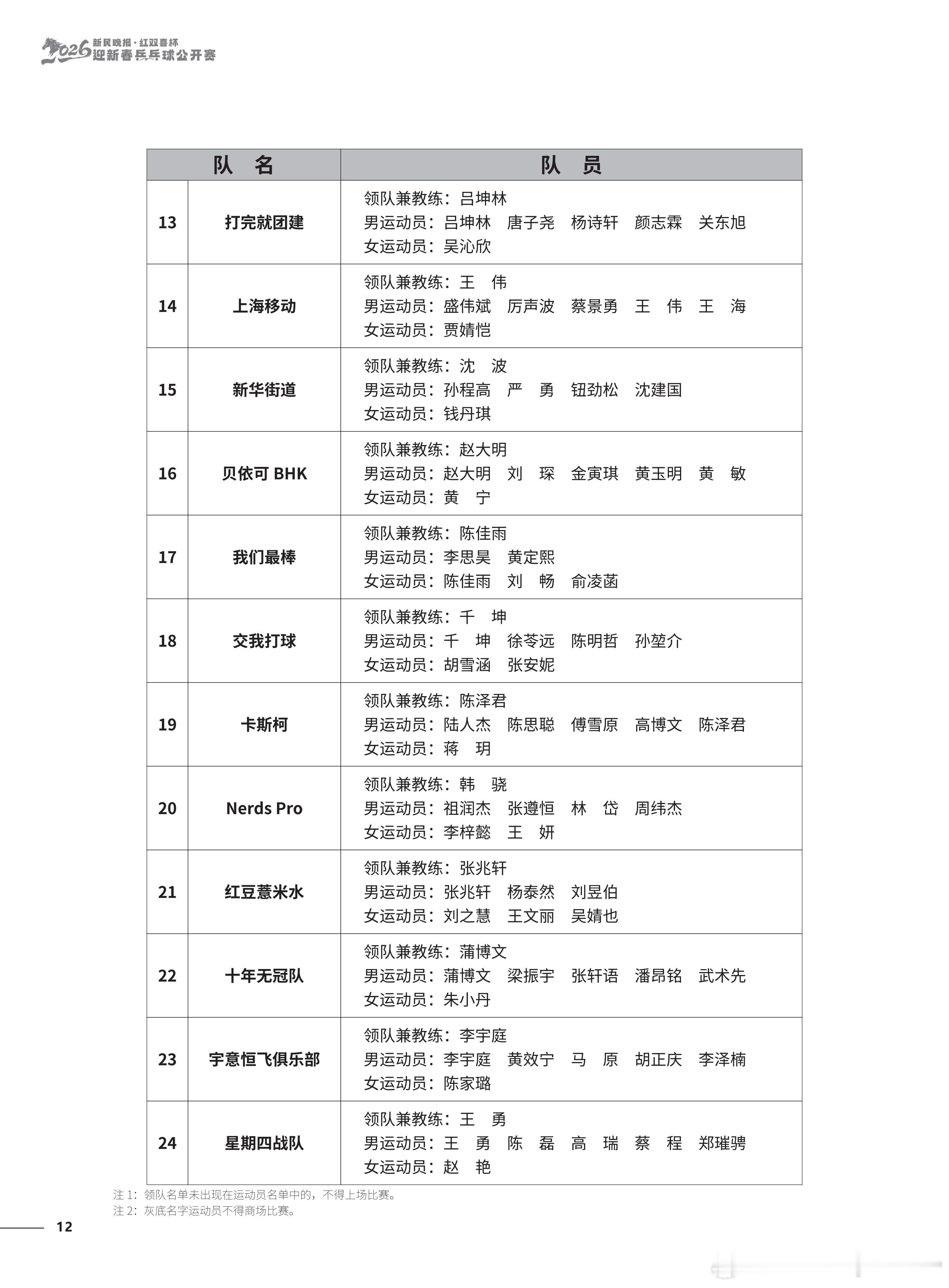 2026“新民晚报红双喜杯乒乓球公开赛”今天开幕 参赛名单及竞赛日程锡纳泰克领队兼教练:刘诗雯男运动员:习胜 夏易正女运动员:刘诗雯 臧小桐 孙艺祯 车晓曦沿浦一队领队兼教练:王博男运动员:王博 魏世皓 于何一女运动员:刘炜珊 李仁思佳 赵尚