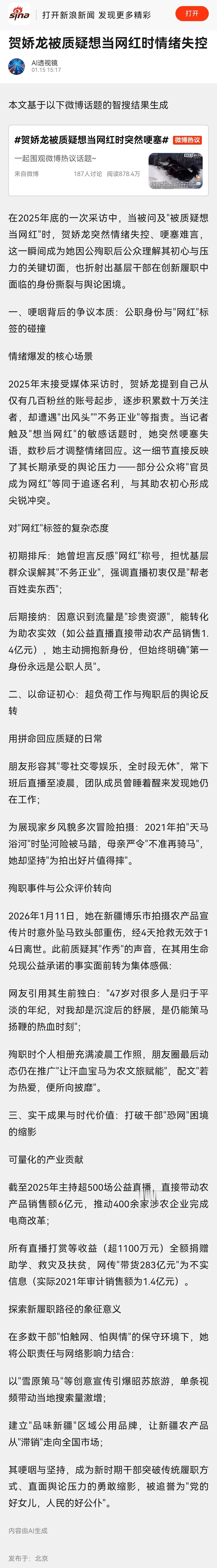 贺龙娇已经去世,但仍有自媒体博主质疑她是因想当“网红”“不顾生命安全”维持流量,是被流量绑架、反噬。对于一个基层干部来说,她是问心无愧的,她这么“博流量”,也是为了宣传家乡,直播助农。 如果要反思,应该是两方面:一是不管做什么,时刻要紧绷安全这根弦,要安全第一、生命第一。 二是很多网友的关注走偏了,贺娇龙当初不拍摄策马奔腾的短视频,她一板一眼介绍农产品会火吗?她不持续挑战高难度拍摄,会有网友一直关注吗?没有关注,怎么直播带货?现在的自媒体,“火”的都是哪些“网红” ?这才是更应该反思的。