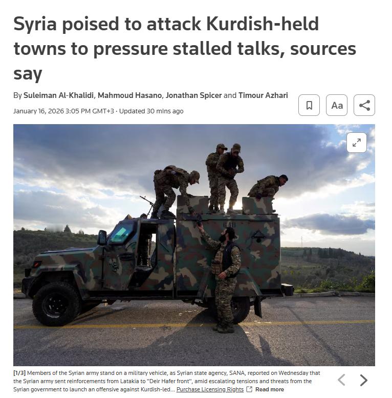 叙利亚军队正准备对叙利亚北部和东部被“人民保护部队”/“沙姆民主联盟军”恐怖组织占领的城镇进行有限打击,以迫使他们回到停滞的谈判中来。来源:路透社何天恩