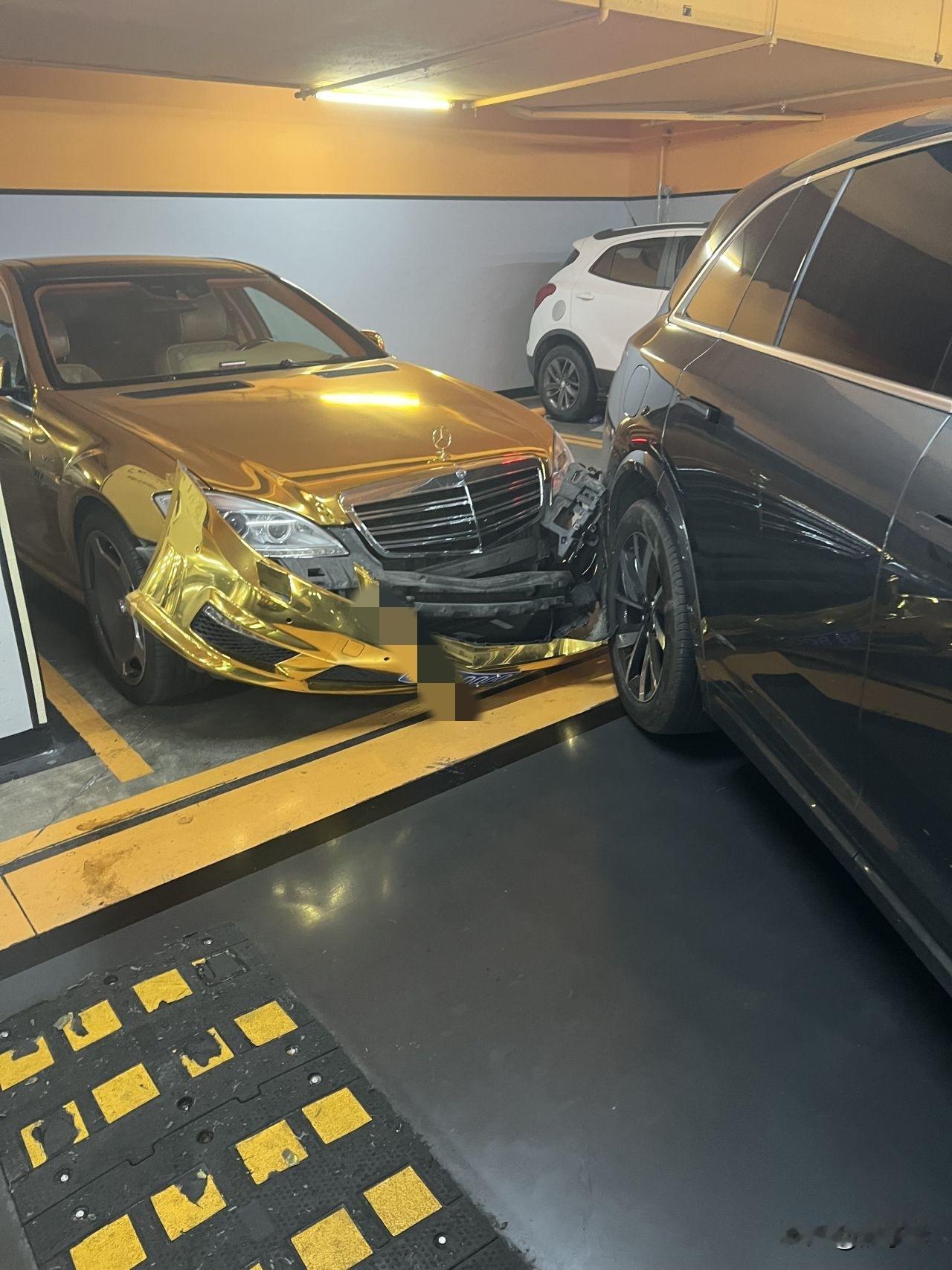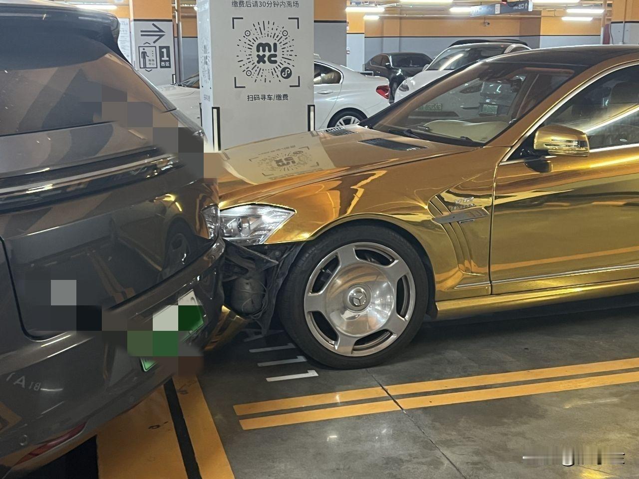 太惨了,这么漂亮的黄金奔驰被撞成这样,不知道这新能源车要赔多少钱! 浙江某地,一辆漂亮的黄金奔驰车静静的停在车库里,那金黄的颜色一看就是贵气逼人,车牌号也很大气! 奈何天降横祸,一辆新能源车不小心碰到奔驰车了! 瞬间奔驰车就被撞的面目全非! 心疼这新能源车,不知道要多少钱才能修复这黄金奔驰。