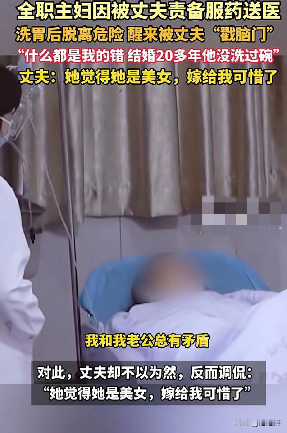 扎心 近日 深圳一名全职主妇娜娜(化名) 因被丈夫责备 服用30多粒安眠药自杀,送医洗胃后脱离危险 然而醒来时,丈夫不仅没有关心,反而用手指戳她的脑门,继续指责 娜娜哭诉,结婚20多年丈夫从没洗过碗 连地上掉的东西都不会捡,所有矛盾都被丈夫归为她的错 面对妻子的崩溃,丈夫却轻佻调侃:“她觉得她是美女,嫁给我可惜了” 医生当场建议将娜娜转入ICU观察,并劝解丈夫“她的付出应该被看见” 你怎么看待这种“看不见全职主妇付出”的婚姻困境?