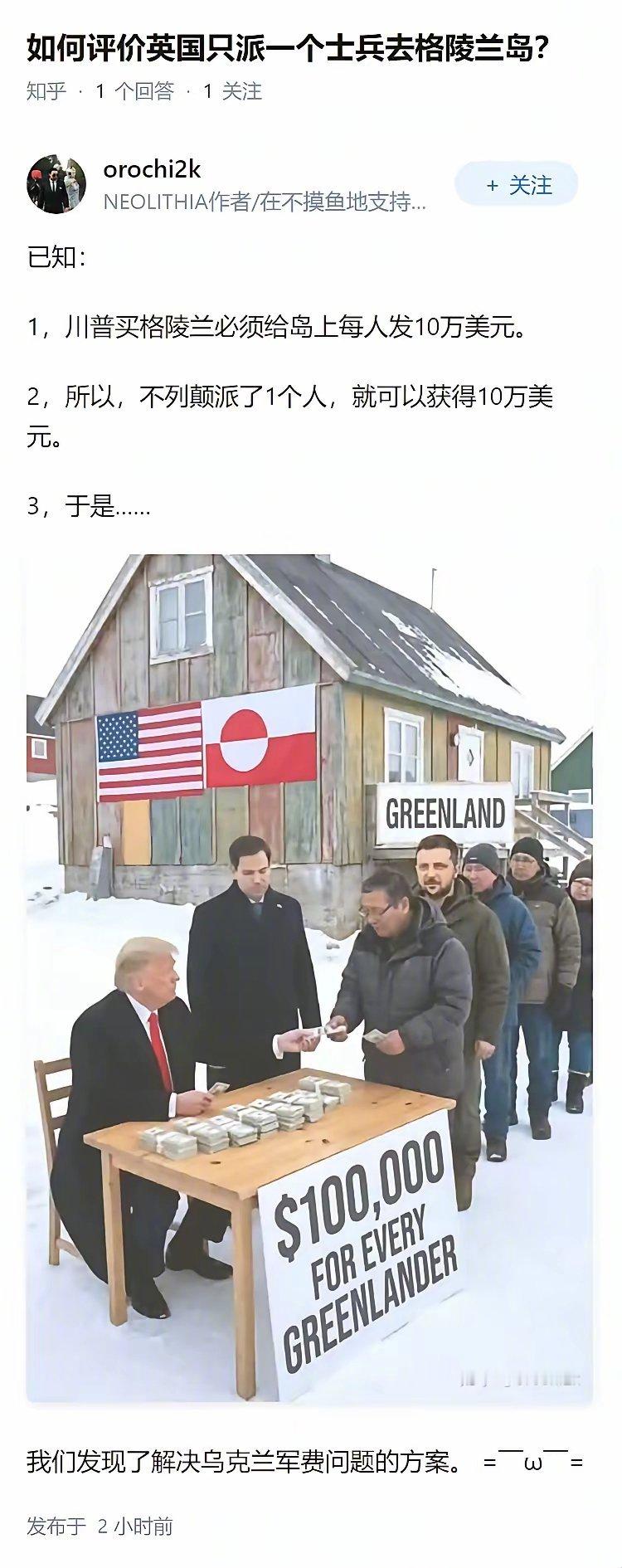 这么说的话,法国派15名士兵去格陵兰岛,岂不是可以从美国赚150万美元,乌克兰可以多派几万乌军去格陵兰岛赚军费