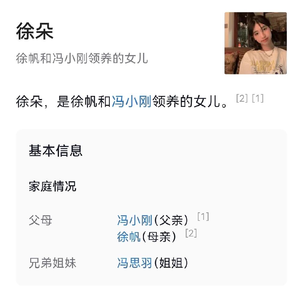 感觉这个冯小刚的这个养女徐朵, 不太像养女。 徐朵和一般的养女太不一样, 一般的养女都不知道自己的身世, 父母一般都瞒着,不会告诉小孩的身份。 但这个徐朵的身份却是公开的, 百度上清晰可查的, 她应该从小就知道。 在这种前提下, 她应该对自己的位置有个清晰的认识, 因为冯小刚还有一个亲生的女儿, 她按道理应该很会做小伏低,察言观色。 但是这次和养母徐帆的公开亮相, 她的样子却非常的有底气, 完全不在意旁边养母的状况, 我行我素,一脸傲娇, 就好像她是冯小刚的真千金一样, 这符合常理吗?