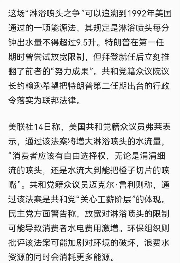 美众议院通过洗澡法案。 其实美国的离谱操作比大家想的多多了,只是大家想象力有限想不到。 比如今天这个淋浴法案,如果不是共和党民主党大战,放过去属于故事会讲出来都没人信的。 美国环保组织出于节约用水的理念,推广了淋浴节水法案,限制淋浴喷头每分钟出水不超过9.5升。你没看错,为了环保,限制大家洗澡的水龙头~ 而且因为背靠政治正确的大旗,你还不好反对,你反对你就是不环保就是不爱护地球就是没有人性。 因此这块过去很少有人科普,国内媒体人哪怕知道,碍于政治正确的原因,也不好多说。 但这次遇上了特朗普,不按套路出牌,直接吐槽,这点水量要站15分钟才能打湿头发,要废止这个法案,把争议彻底拉上台面,一来一回讨论就出圈了。
