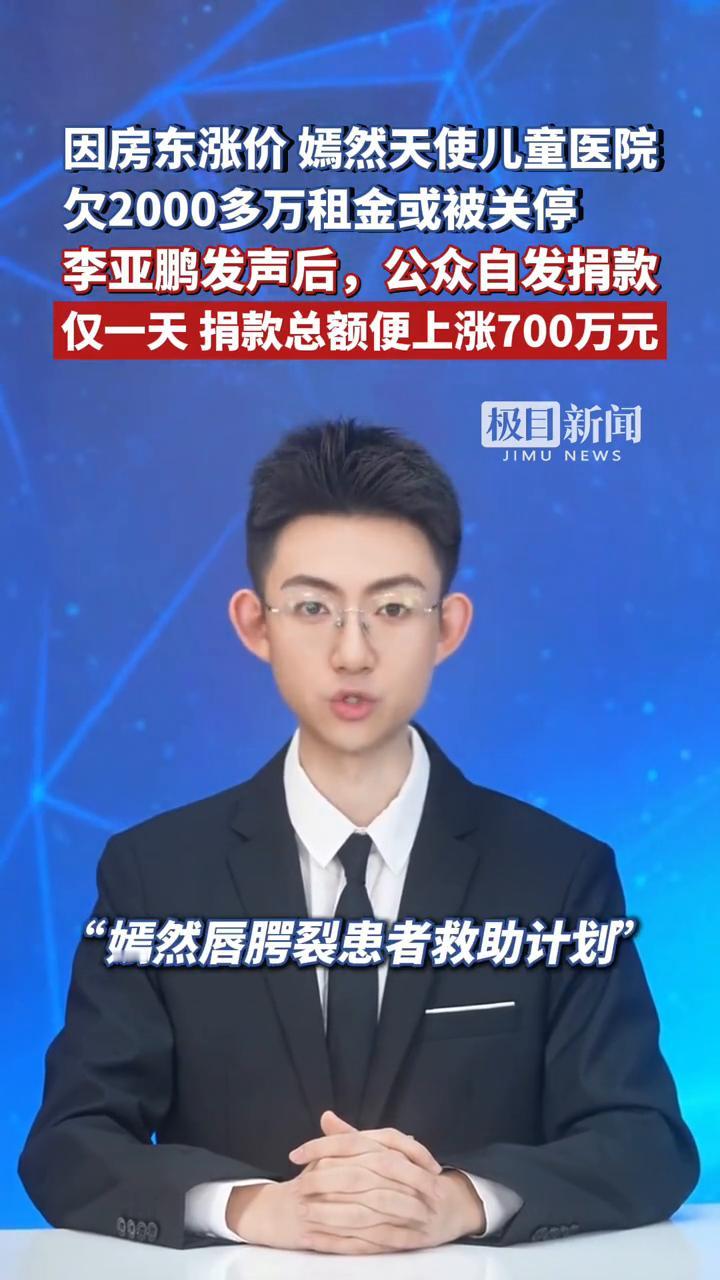 因房东涨价嫣然天使儿童医院欠2000多万租金或被关停,李亚鹏发声后公众自发捐款。 仅一天捐款总额便上涨700万元,网友用真金白银给了李亚鹏一个温暖的反转。近日李亚鹏旗下嫣然天使儿童医院陷入拖欠租金风波,1月14日他发视频提到过去10年间医院完成了一万一千台唇腭裂手术,其中7000名患儿全额免费。 欠租是房东在2019年要求房租翻倍,因医院搬迁困难不得不答应要求。过去5年李亚鹏已支付2500万,欠下的2600万其实是翻倍增长的部分。李亚鹏红着眼眶承认法理上确实欠租,情怀大过了能力。这段视频让全网破防,不少网友涌入"嫣然唇腭裂患者救助计划"入口捐款。 1月16日上午极目新闻记者注意到对比15日上午的212万元捐款总额已达到936万,仅一天时间就上涨了700多万元。嫣然出名 嫣然天使童医院 嫣然儿童医院 嫣然天使儿童院 嫣然出名 嫣然天使童医院 嫣然儿童医院 嫣然天使儿童院 嫣然天使公益