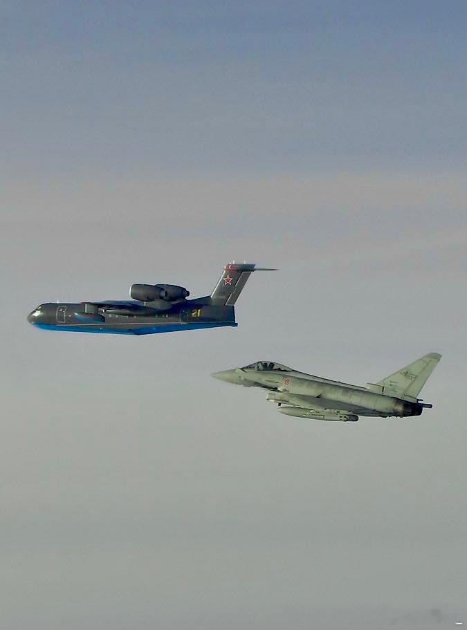 意大利台风战斗机昨天从爱沙尼亚起飞,伴飞一架俄军别-200喷气式水上飞机。别-200于1998年首飞,共制造20架,大部分为紧急情况部订购;俄军(海航)仅列装3架。俄罗斯海军
