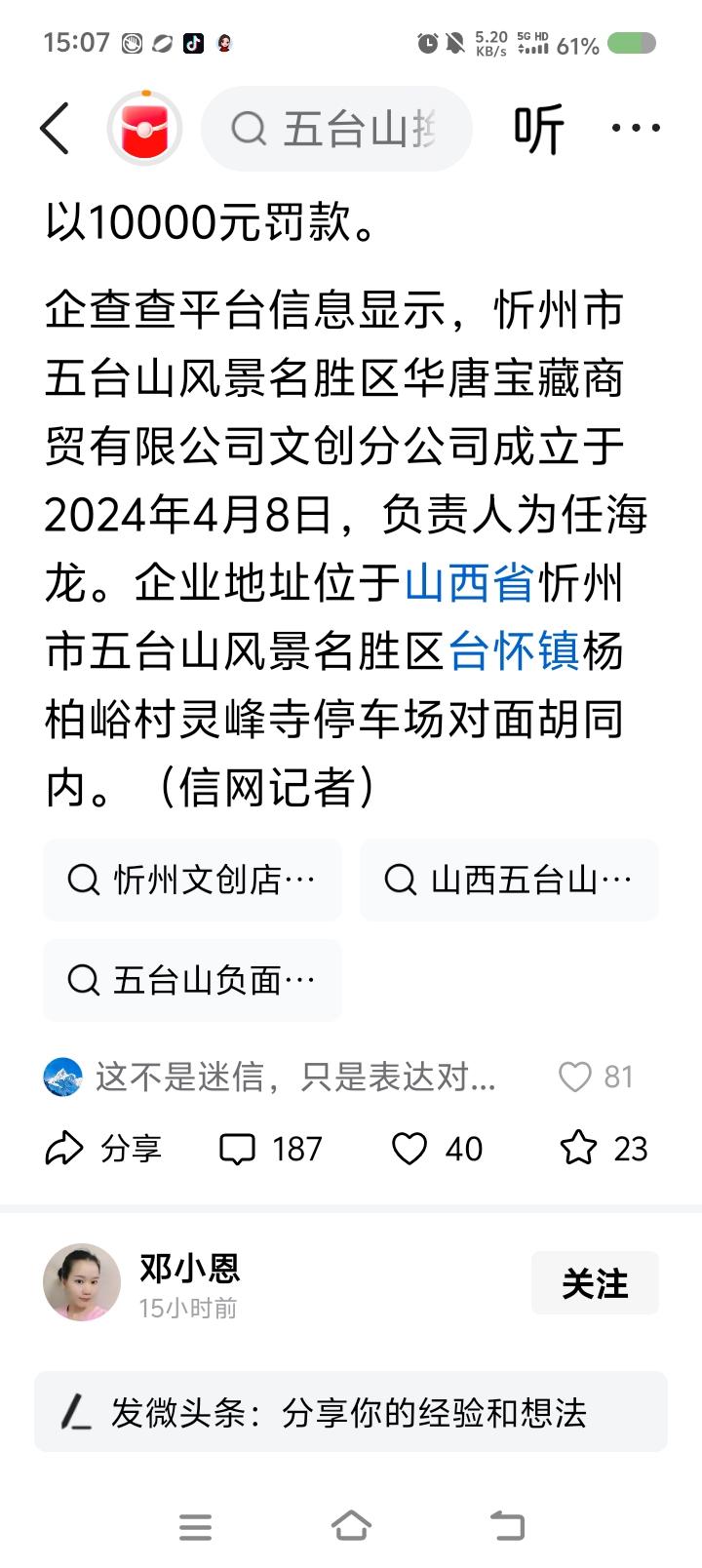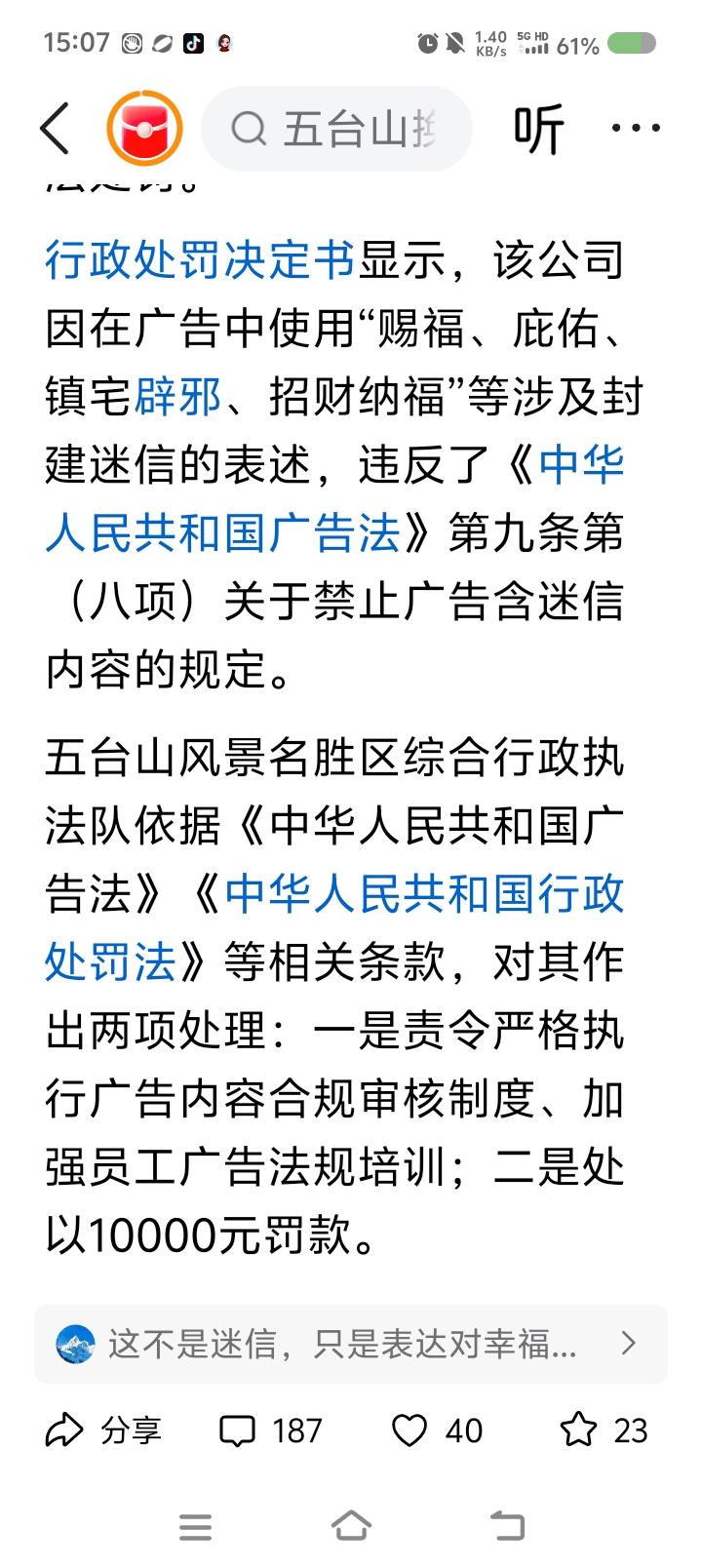 五台山景区内某公司被罚款!—— 据报道,五台山景区内某公司因广告内含封建迷信内容被罚款。 点评: 中国宗教场所性质的景区内,应禁止一切公司的经营活动及宣传。 某关帝庙内商家不少,香火有不同等级,严重影响游客观感,严重违背关羽精神,令人愤怒。