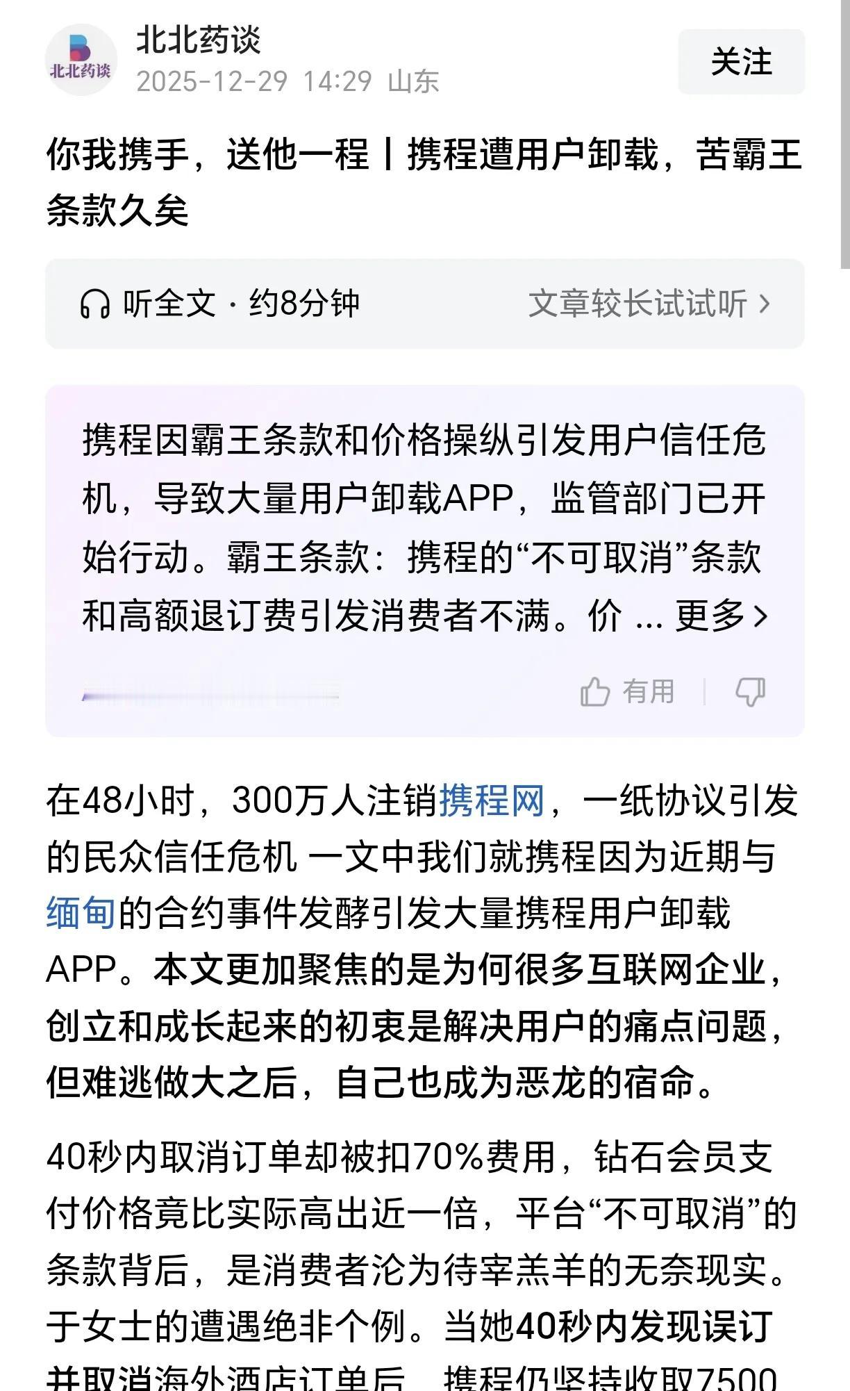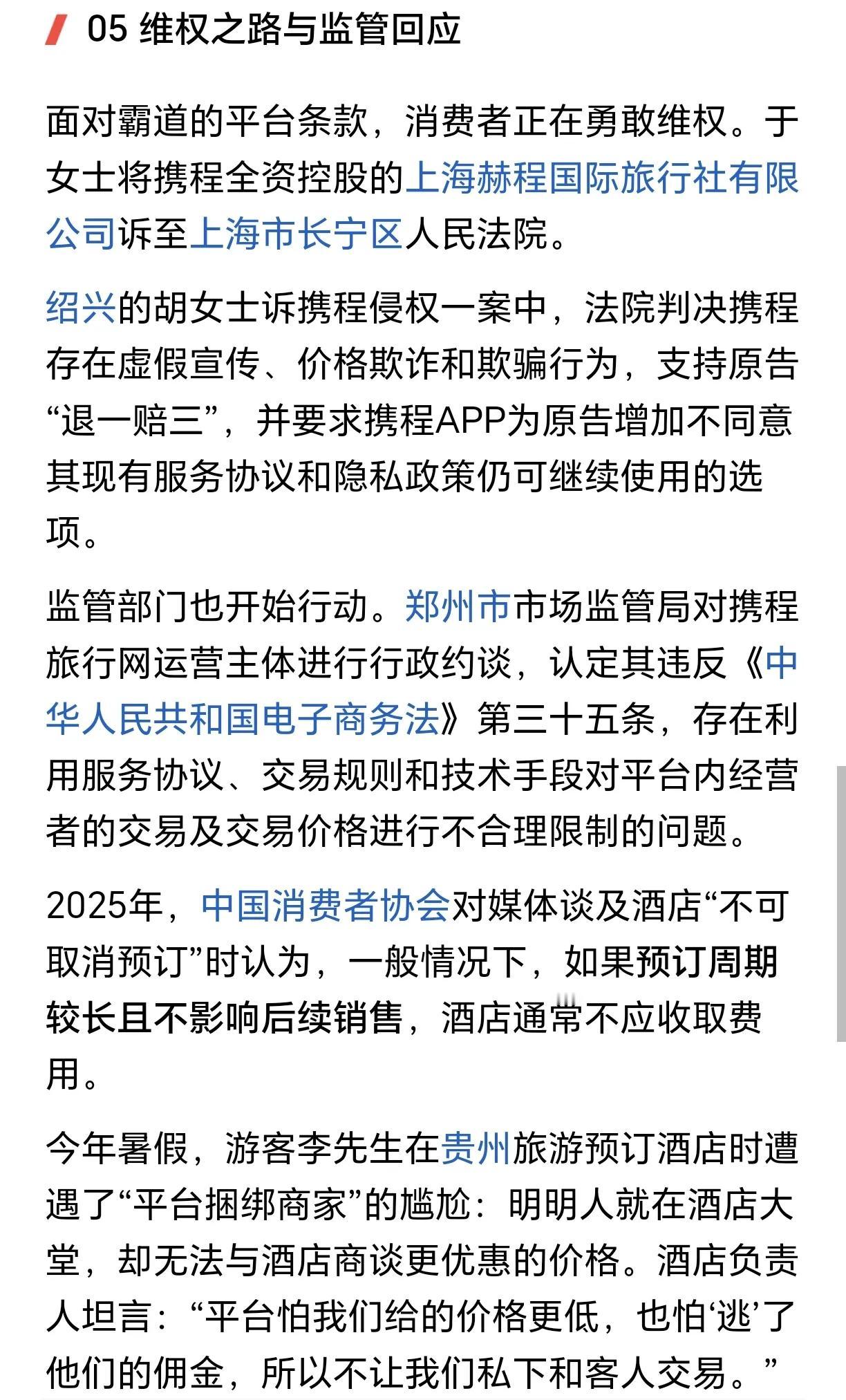 携程吃相太难看了,它的高利润,是建立在用自己的占据56%市场份额的平台优势来对用户流量把持,还有对旅游产业商家的二选一式压榨上。 它的股权是分散的,但前十大股东基本都是美国资本,较大的国内股东还是百度这样的公司。这决定了它的经营策略和方向是以不择手段攫取利润为至高目标。其参股投资的多家旅游行业公司,在业内已形成以其为首的携程系巨无霸文旅资本集团。 携程多年来就有客户信息泄露的争议,甚至出现过多次出现用户预订后遭精准诈骗的事情,但平台多以“无证据证明泄露”回应。 携程最近一次争议新闻,就是在东南亚电诈园区新闻报道正盛时,高调宣布和柬埔寨合作说要为其带去更多游客,引起众多网友忧虑卸载携程时,又出现了手机卸载携程应用困难、用户陷入霸王条款等等争议。 如何看待携程被反垄断立案调查携程乱象 携程网 携程旅行公司 携程集团 携程费用