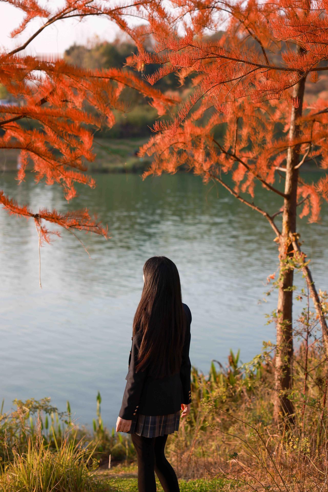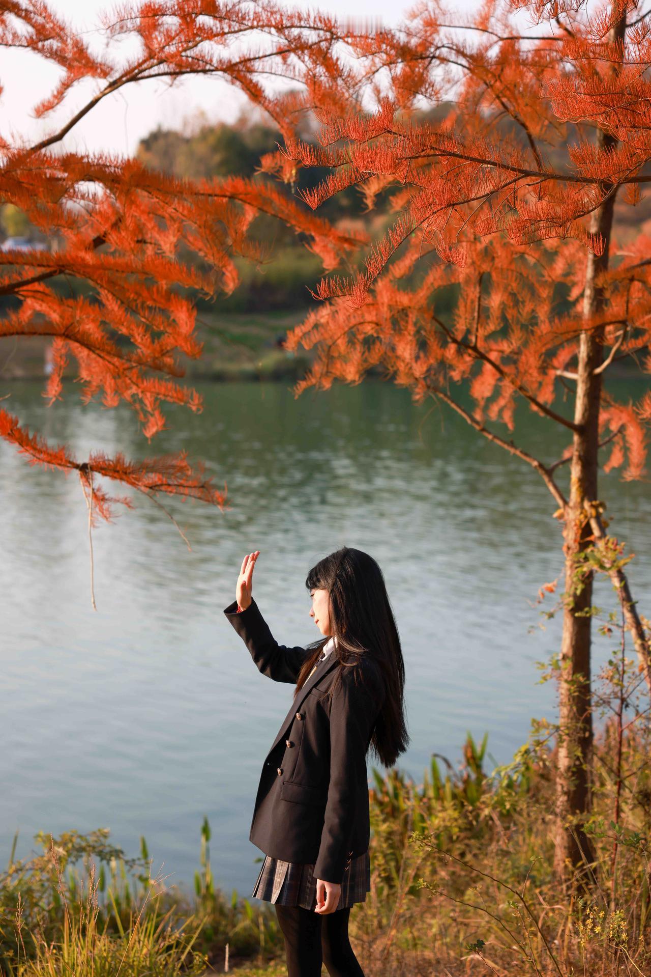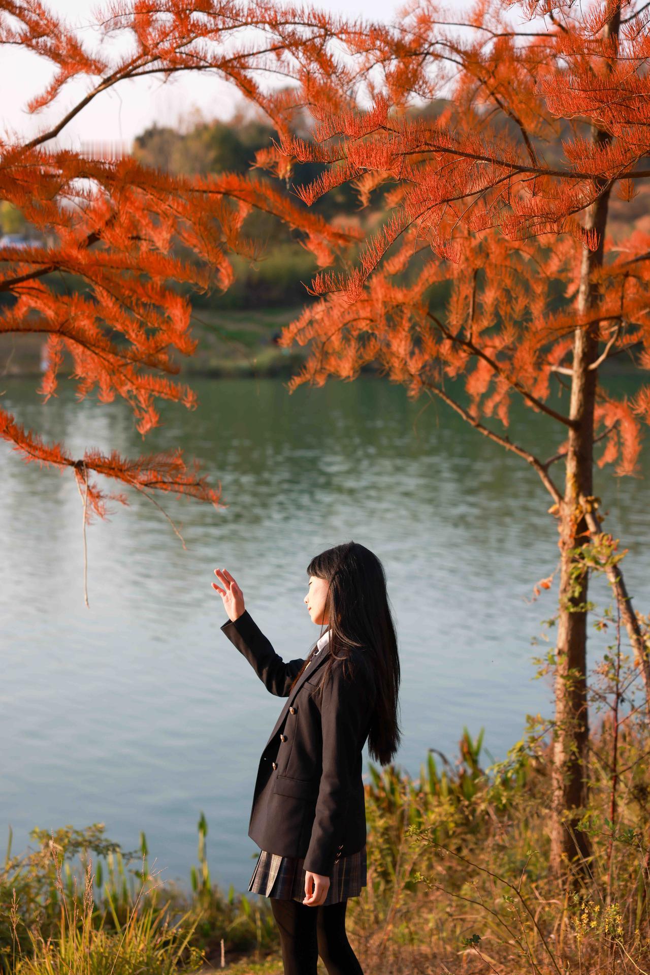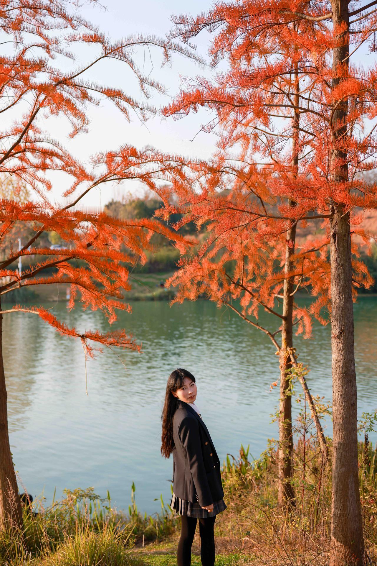 组图|秋日的湖畔 冬日午后的湖畔,水杉把浓烈的红泼洒在枝头,像一团团燃烧的火焰。女孩穿着简约的黑色西装外套与格纹裙,站在暖黄的光晕里,时而抬手轻触垂落的杉叶,时而静立望向湖面,任风拂过长发。澄澈的湖水漾着细碎波光,将树影、人影都揉进温柔的涟漪里,时光也跟着慢了下来。 水杉风景 秋日水杉林 冬日之水杉 水杉秋色