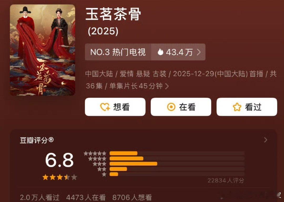 侯明昊娜扎《玉茗茶骨》豆瓣开分6.8分,大家觉得高了还是低了?!
