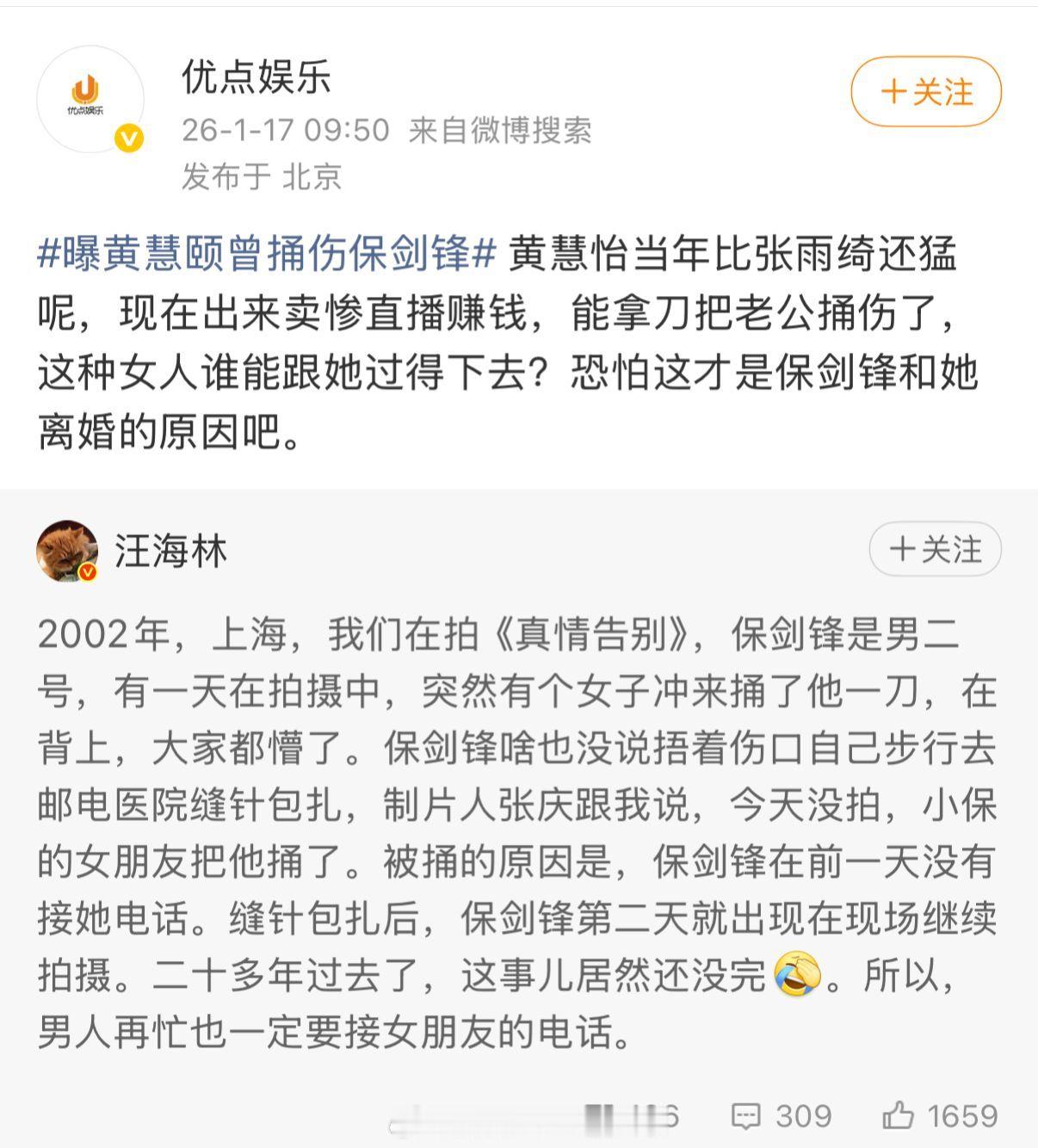 啊?保剑锋这事,有后续了。有圈内人和狗仔说,黄慧颐曾经拿刀捅保剑锋。